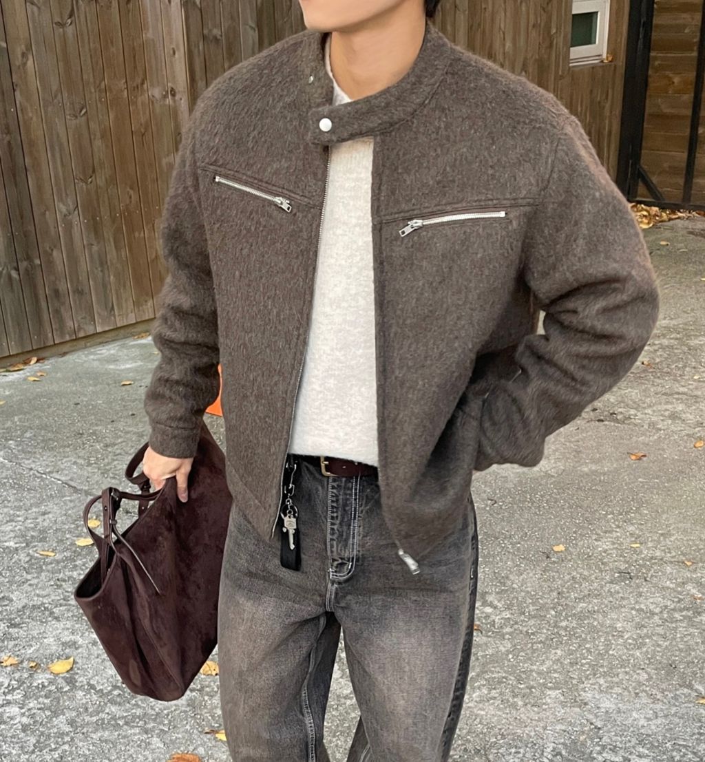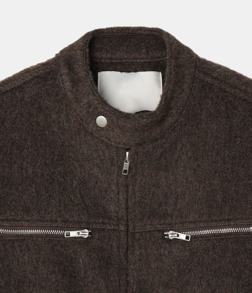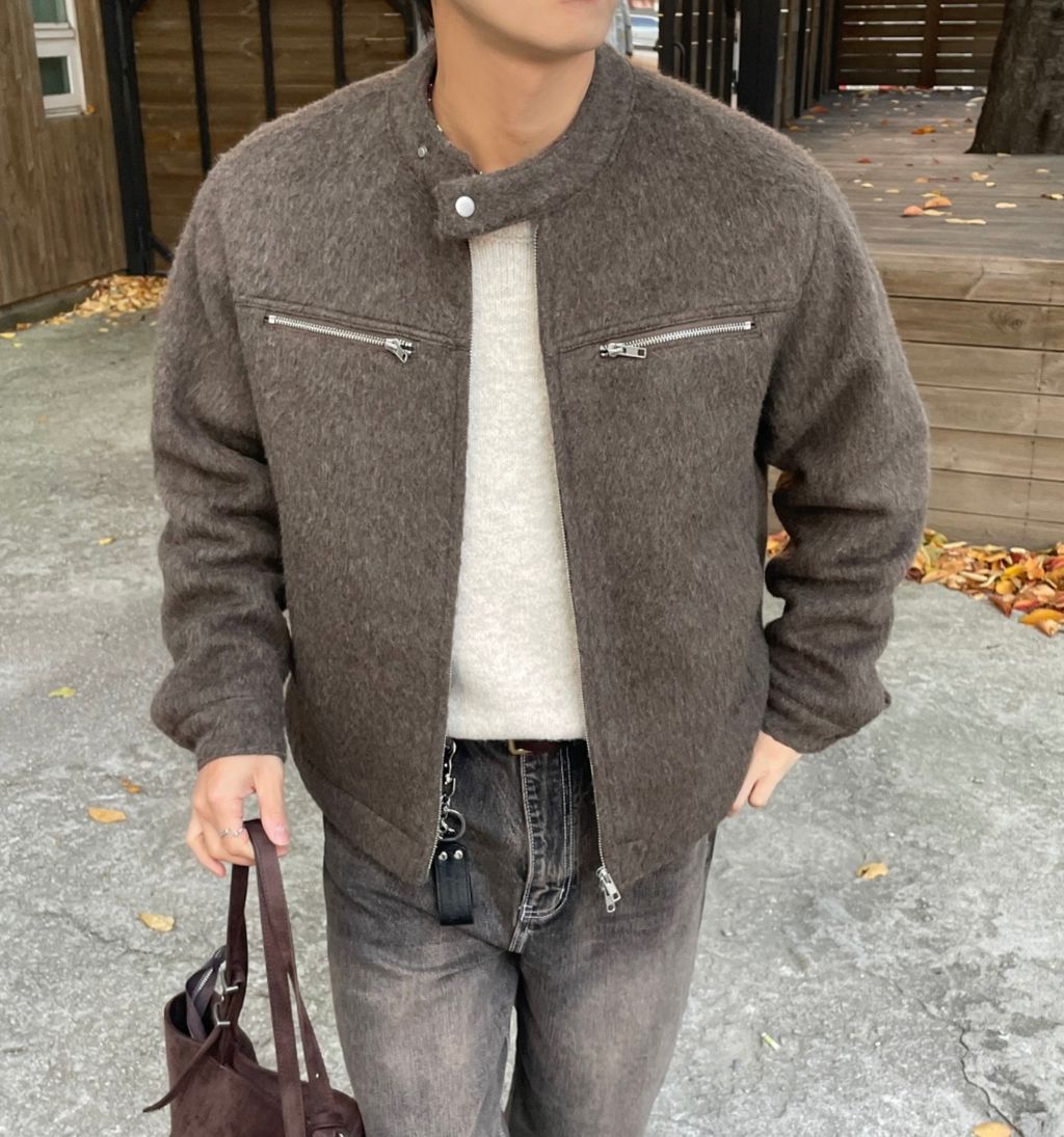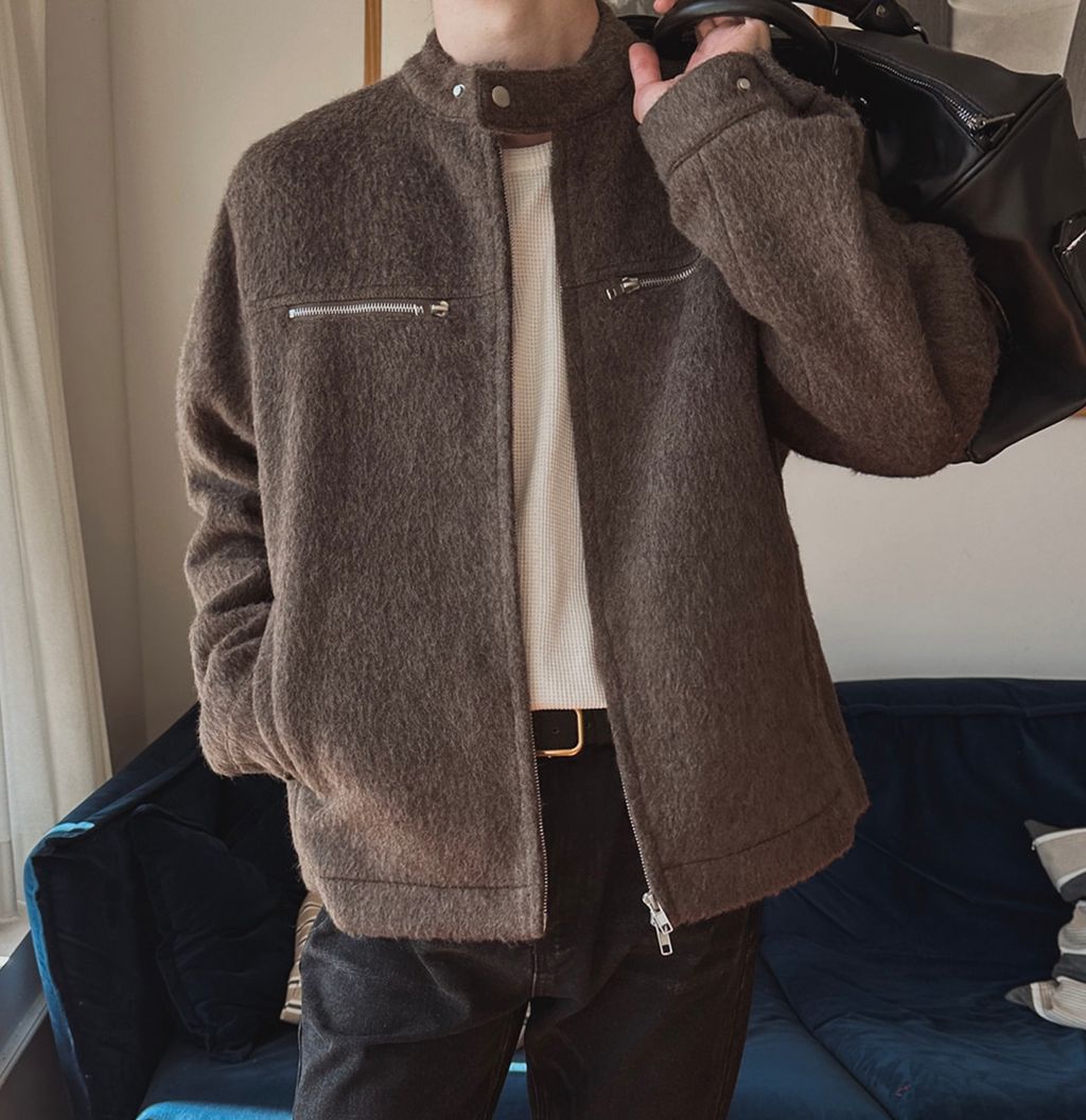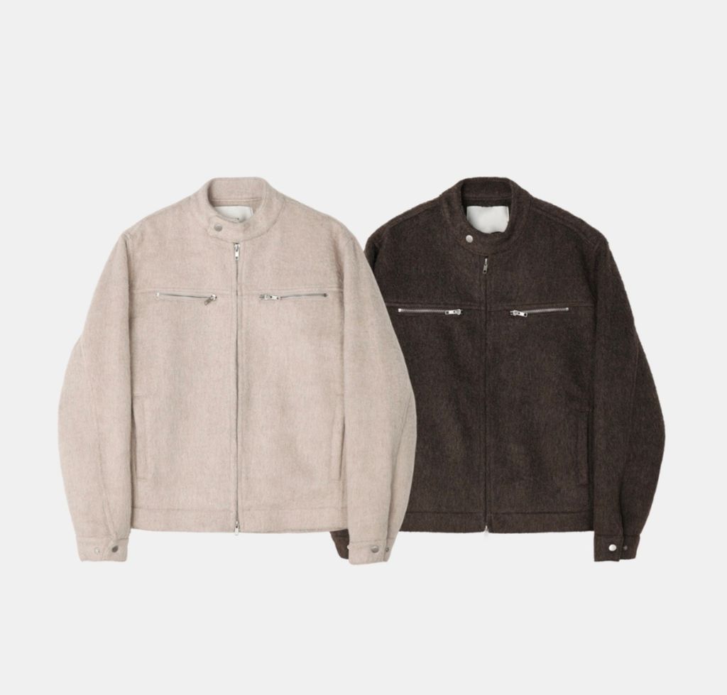 海馬毛 混羊毛 無領 騎士夾克短版 兩色
