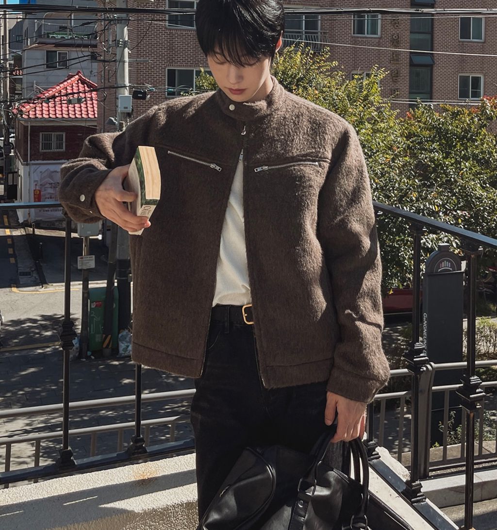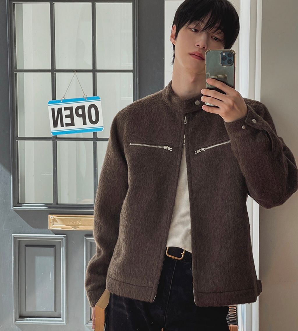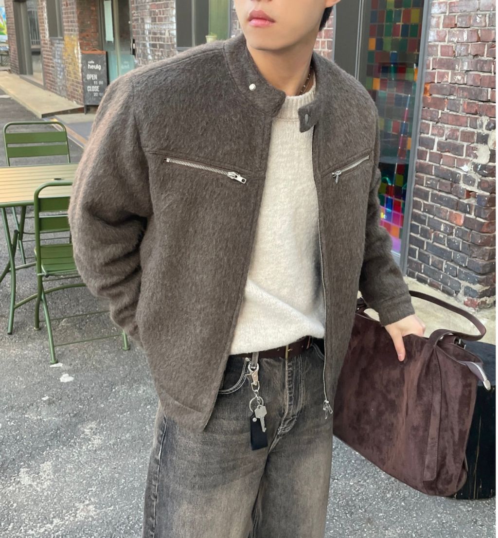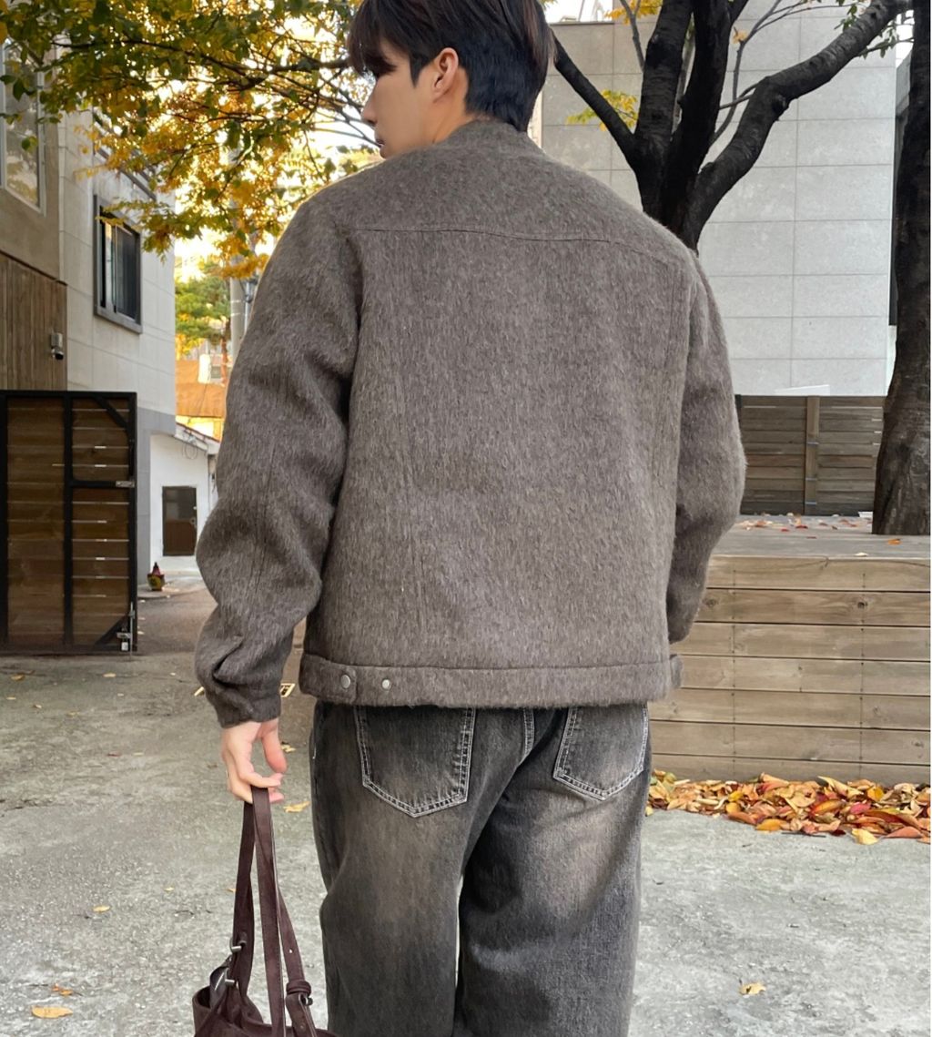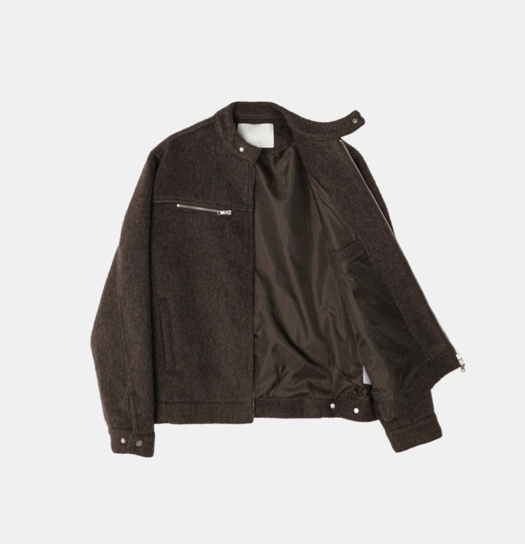 海馬毛 混羊毛 無領 騎士夾克短版 兩色