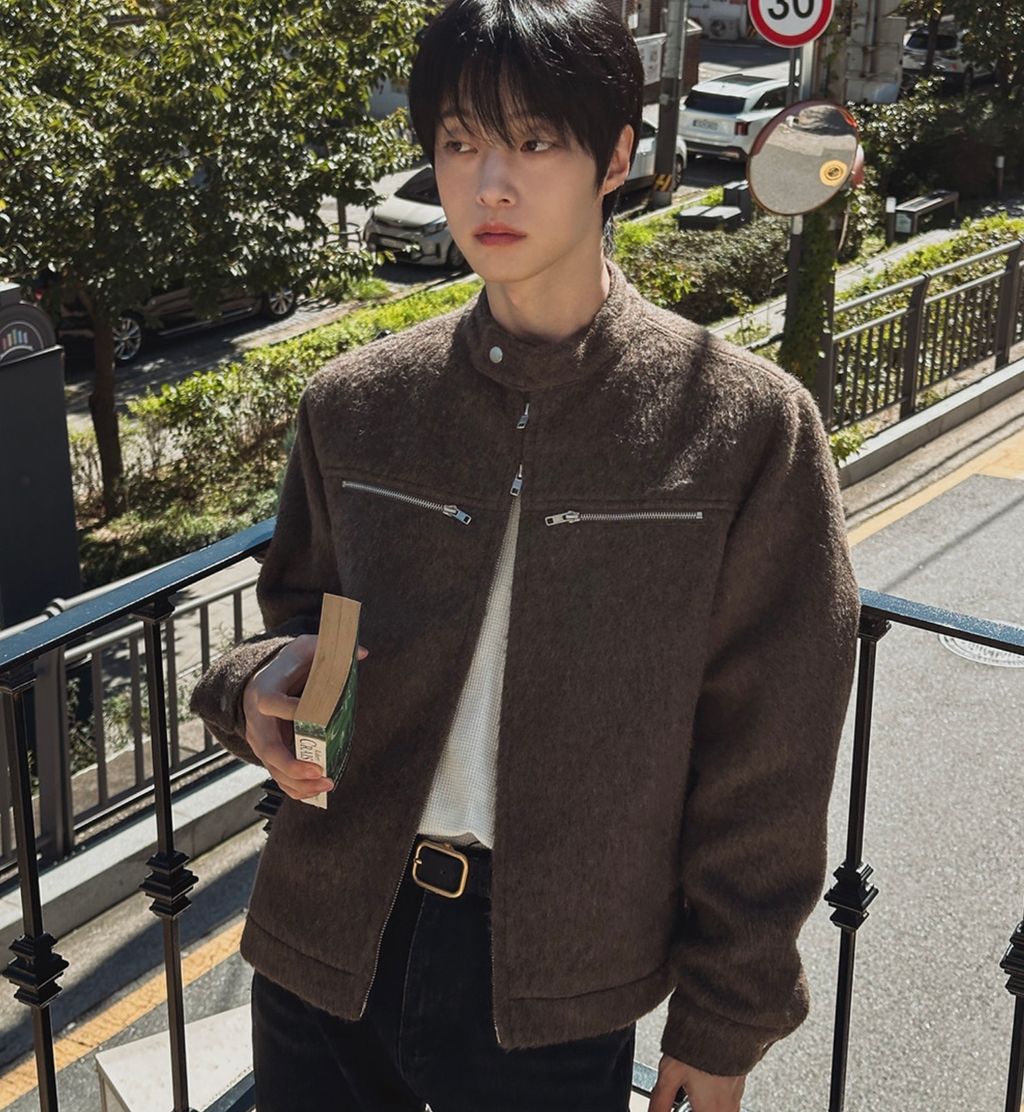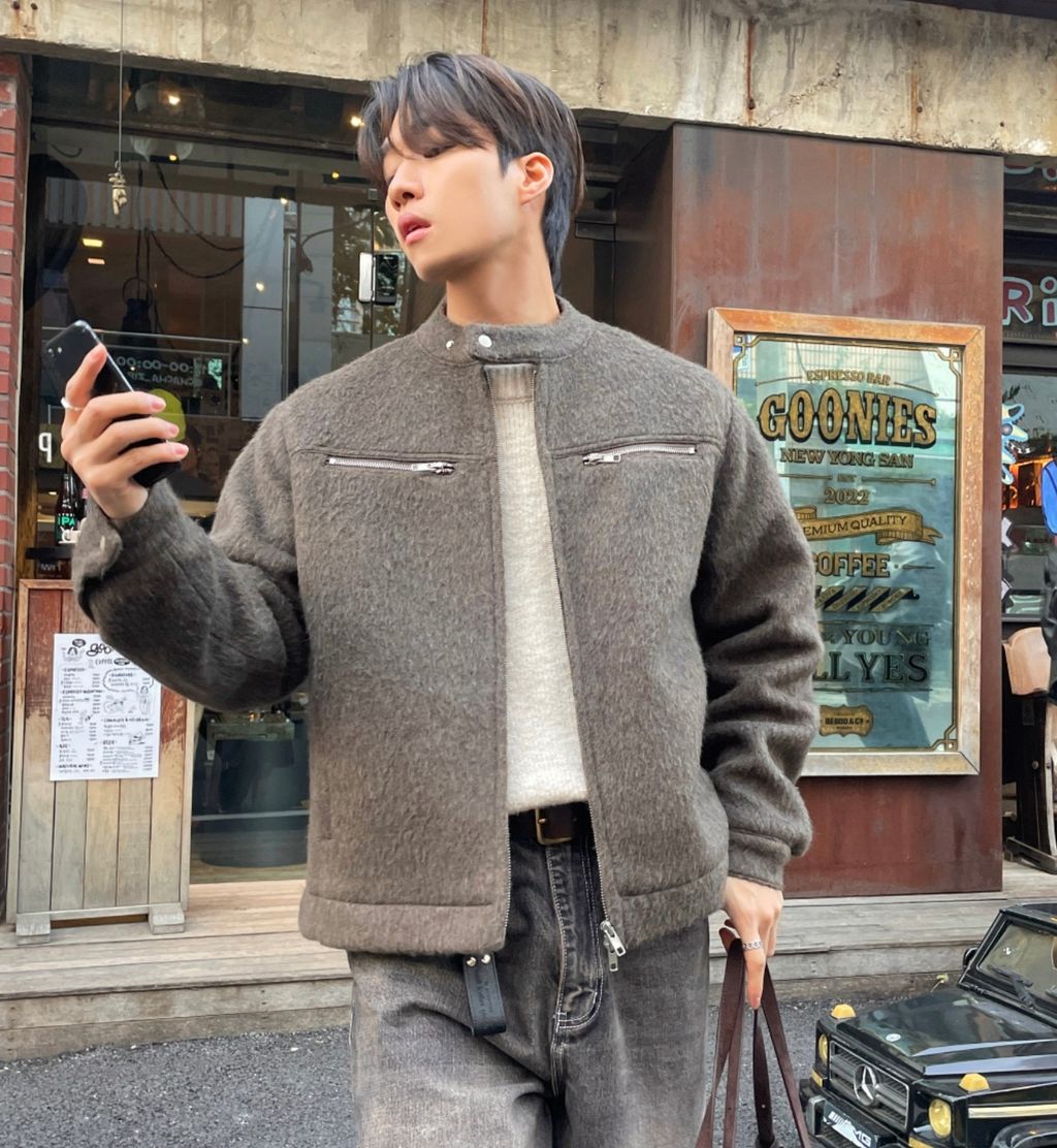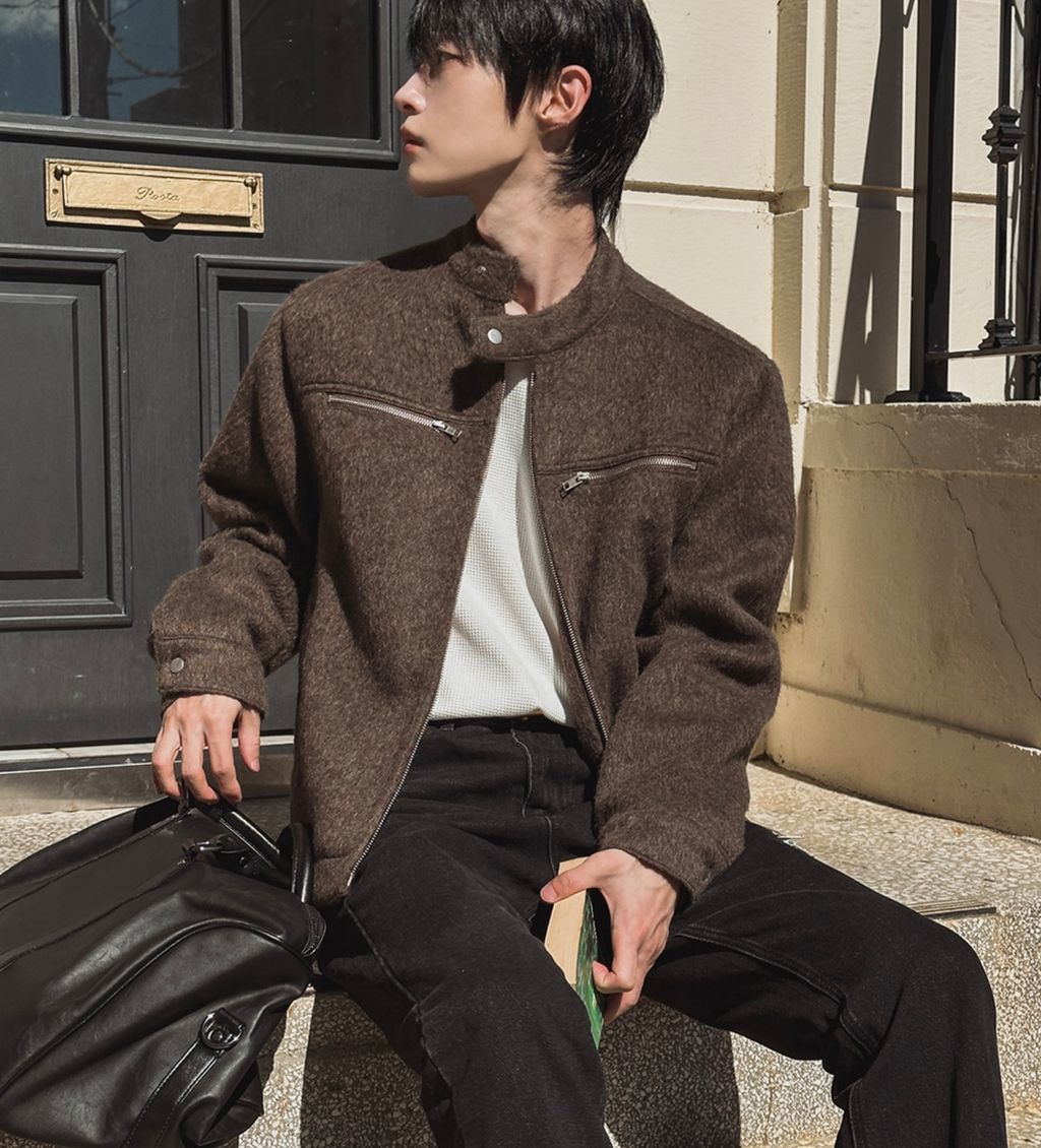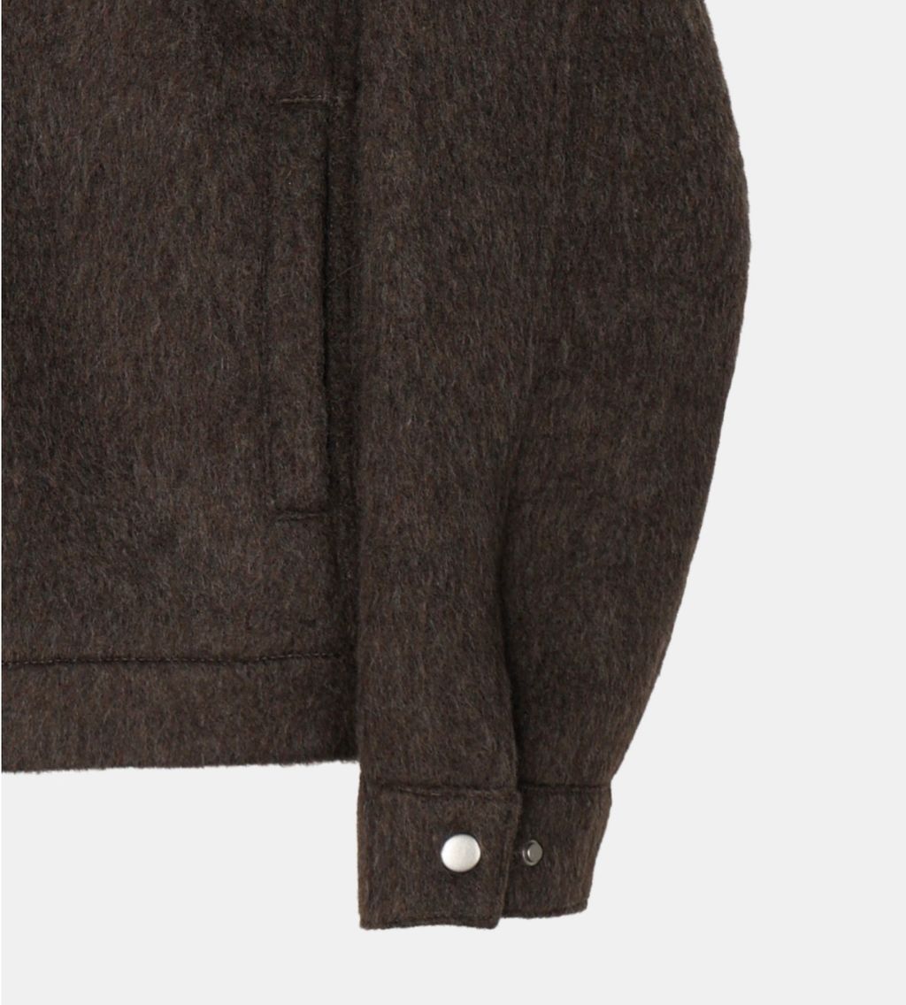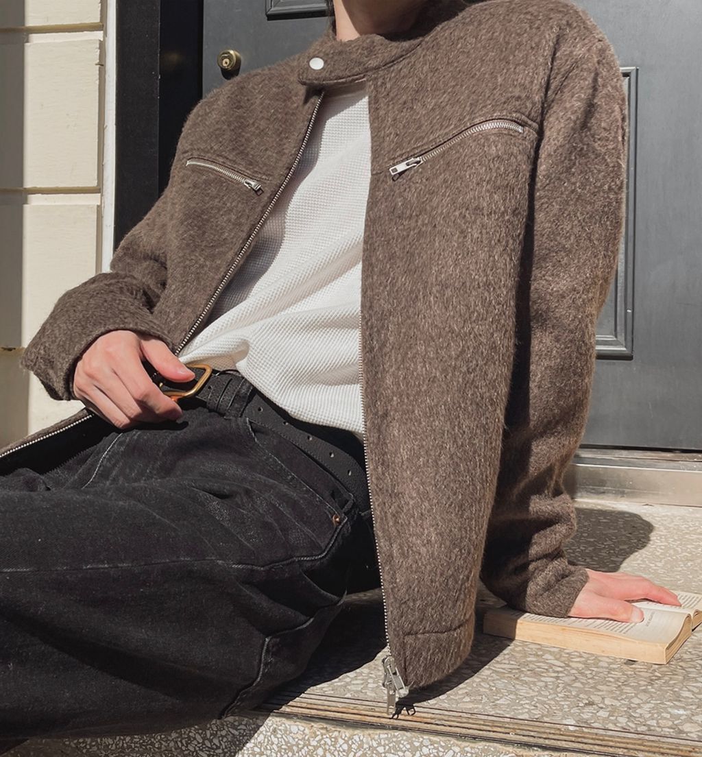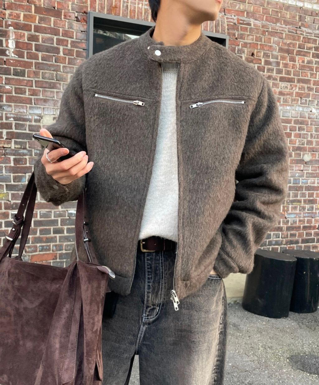 海馬毛 混羊毛 無領 騎士夾克短版 兩色