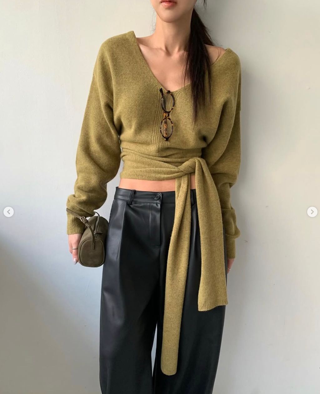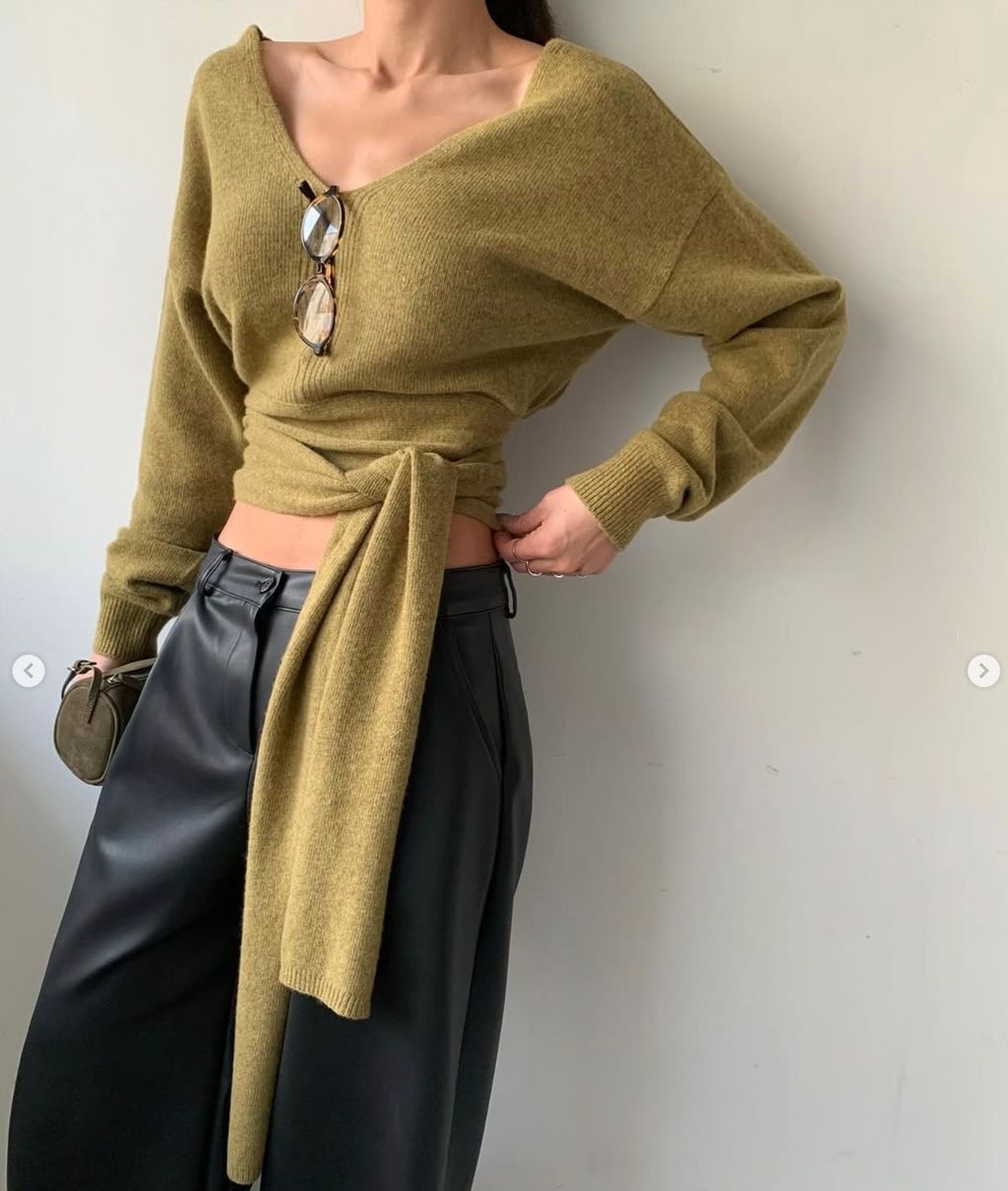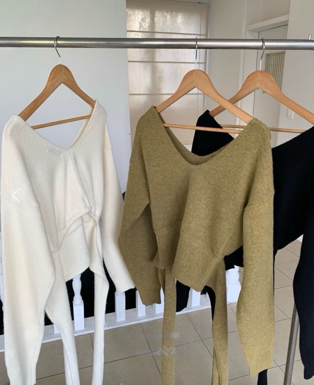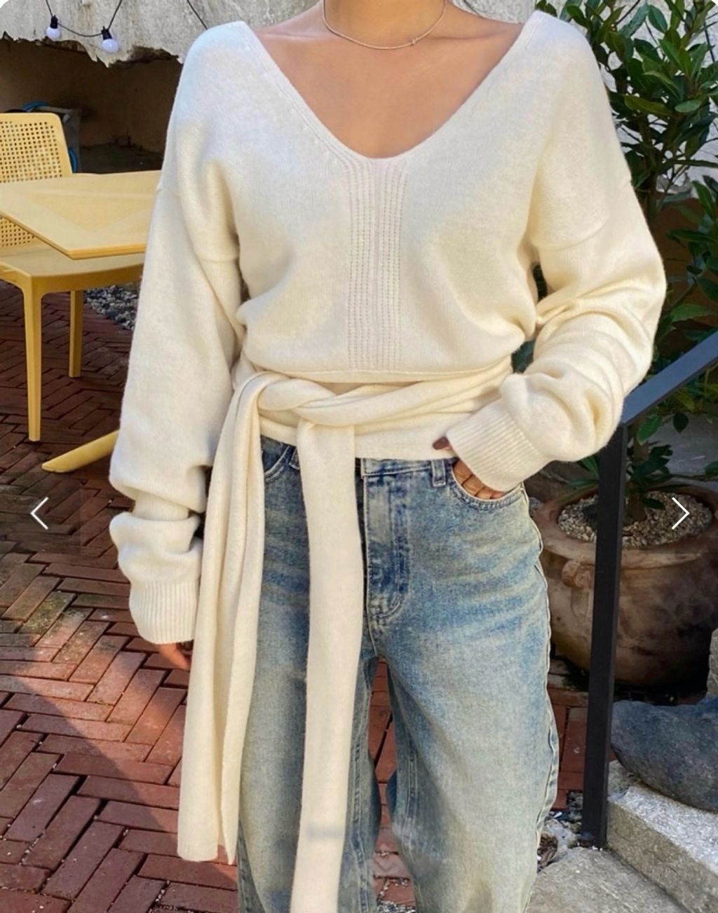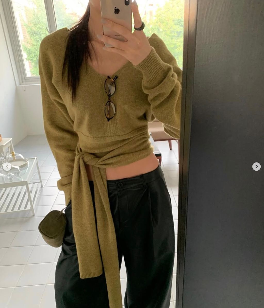 江南風格 下擺綁帶 深V領 針織衫 三色