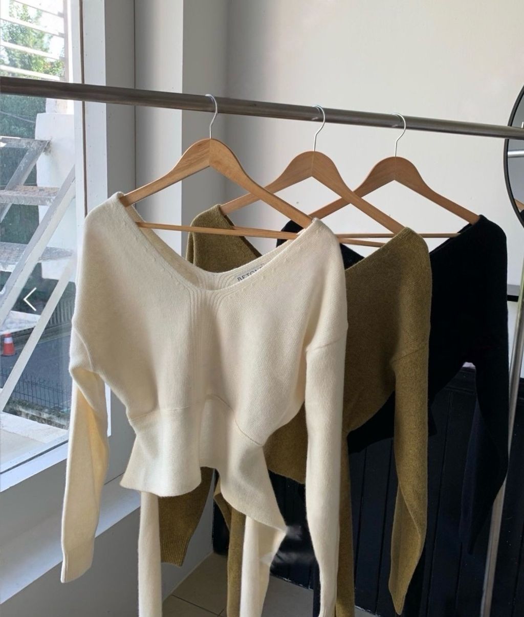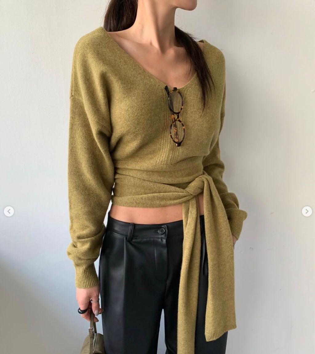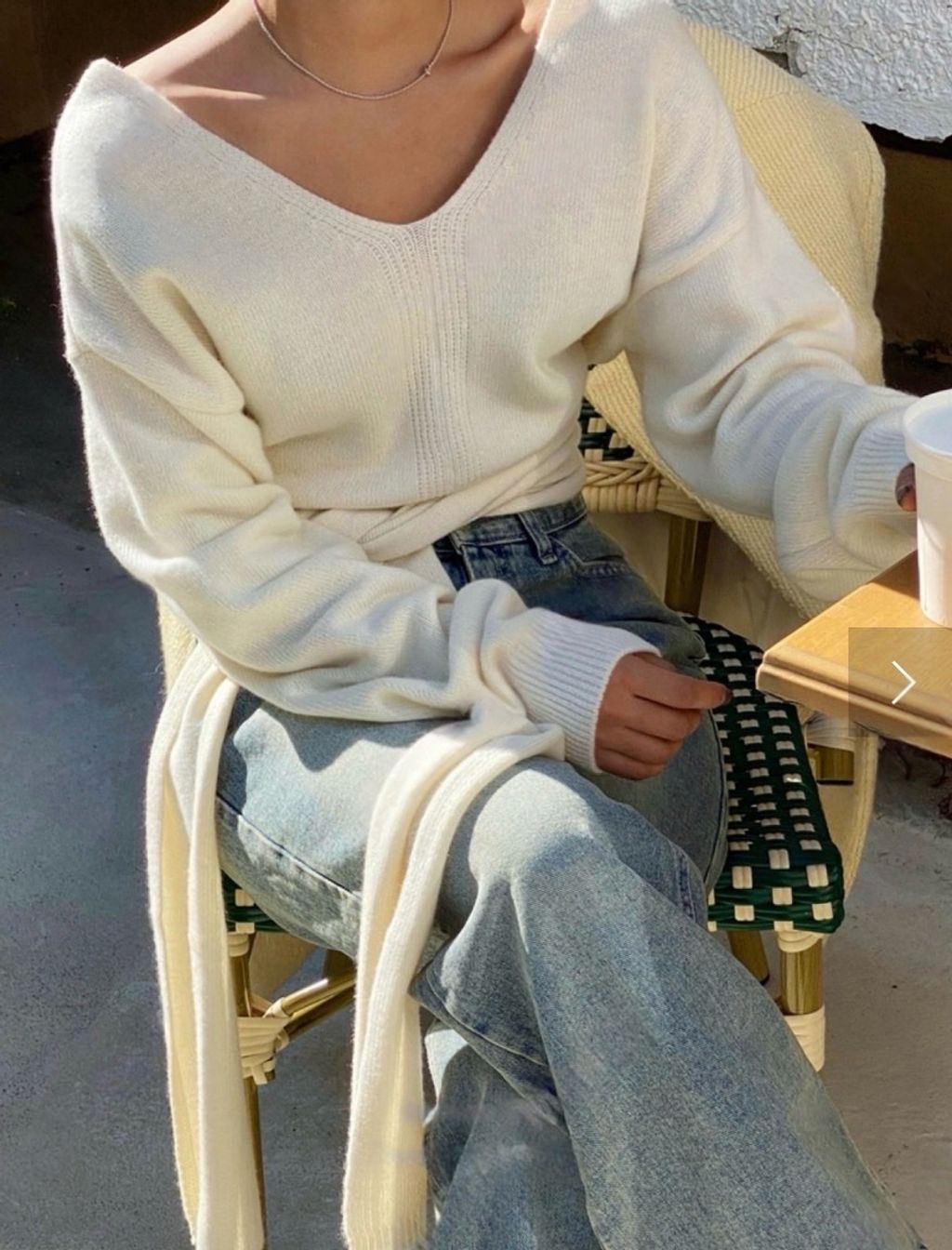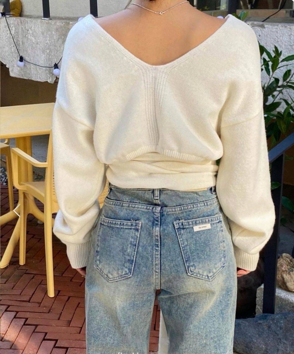 江南風格 下擺綁帶 深V領 針織衫 三色