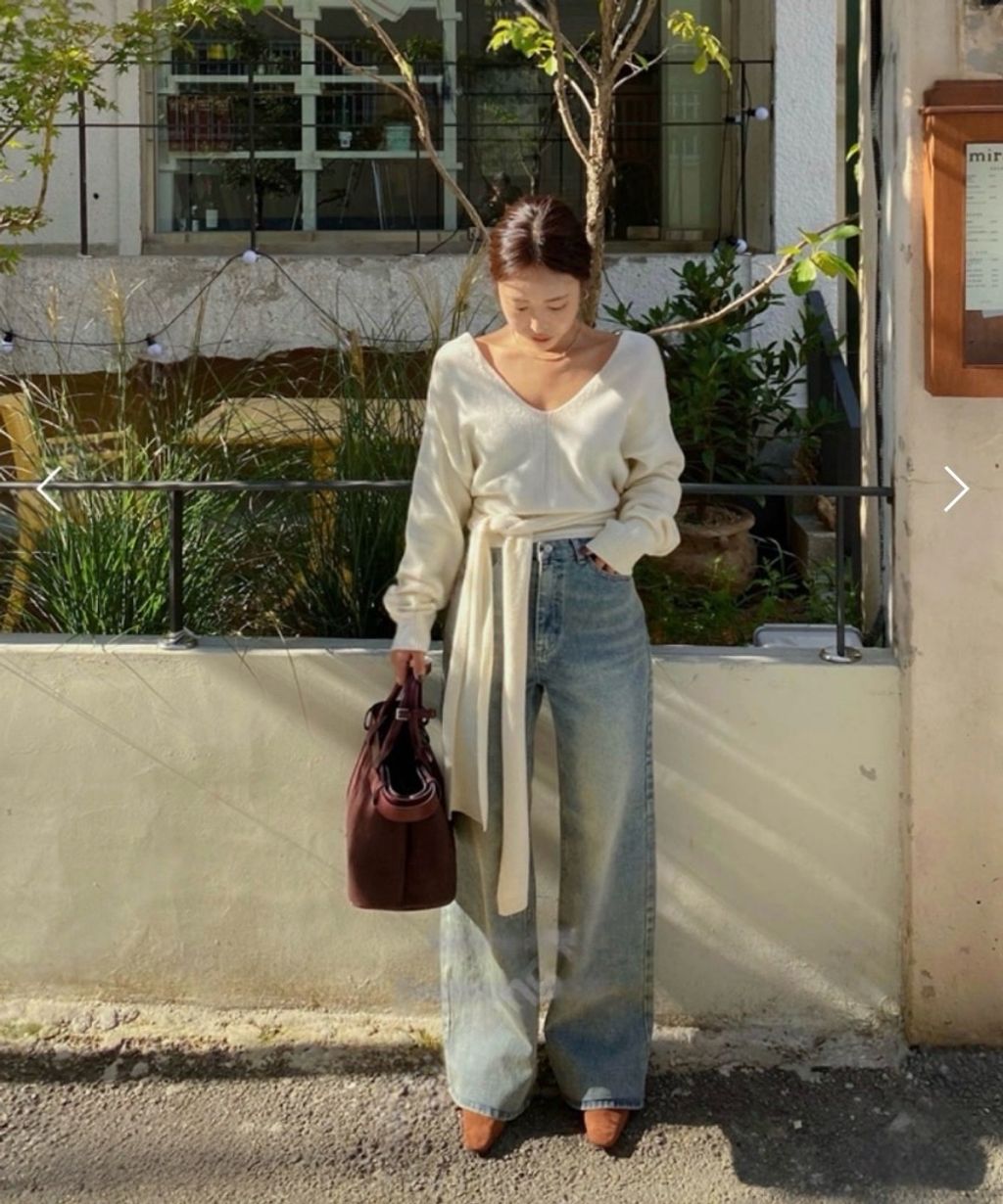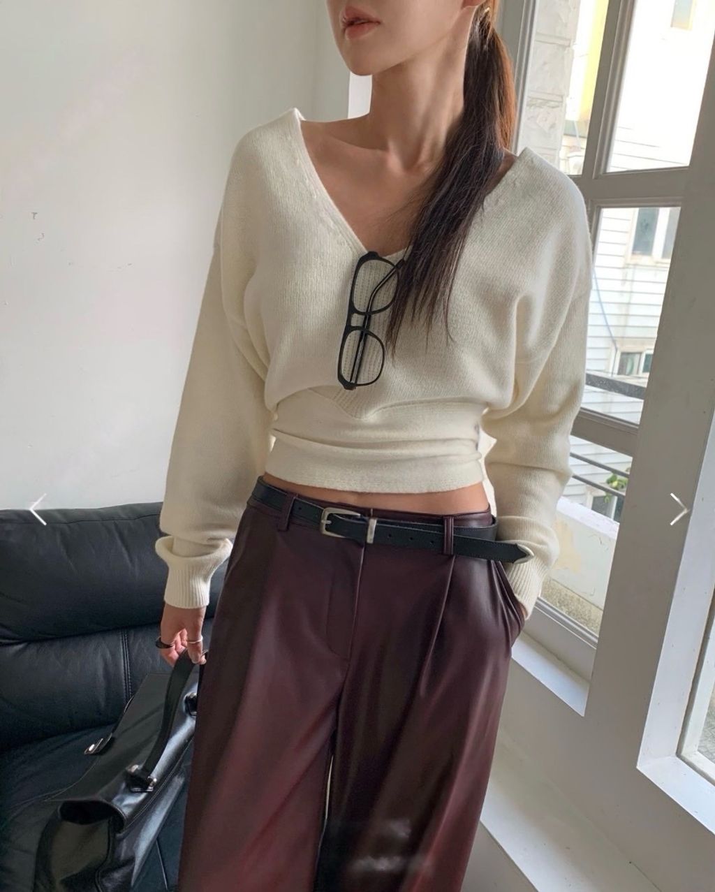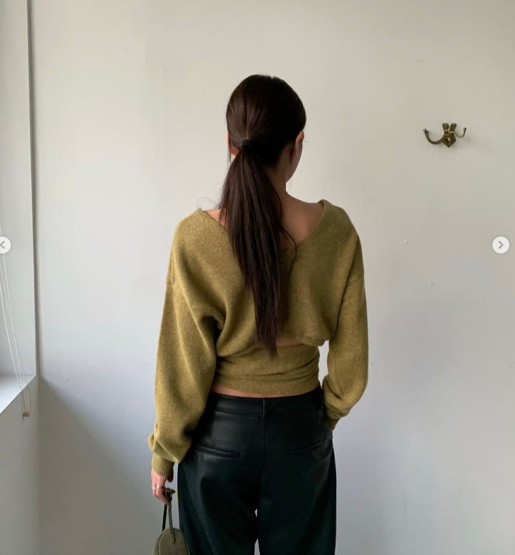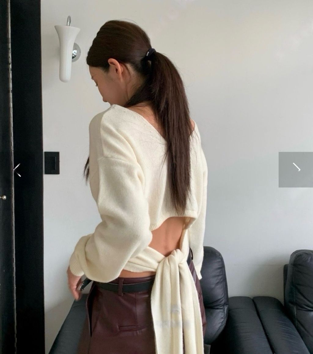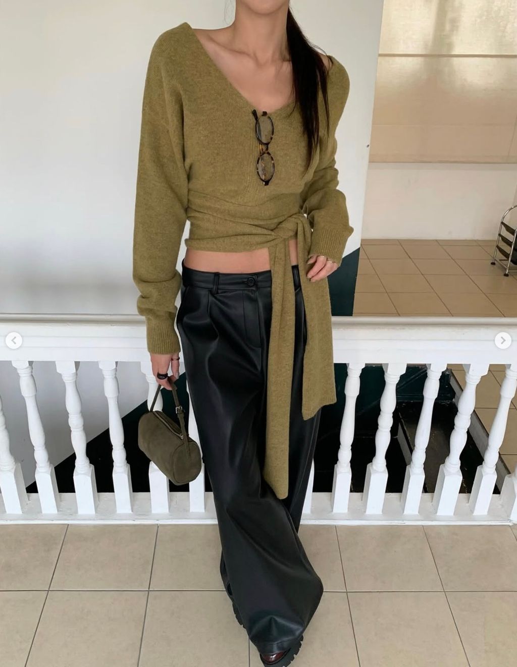 江南風格 下擺綁帶 深V領 針織衫 三色