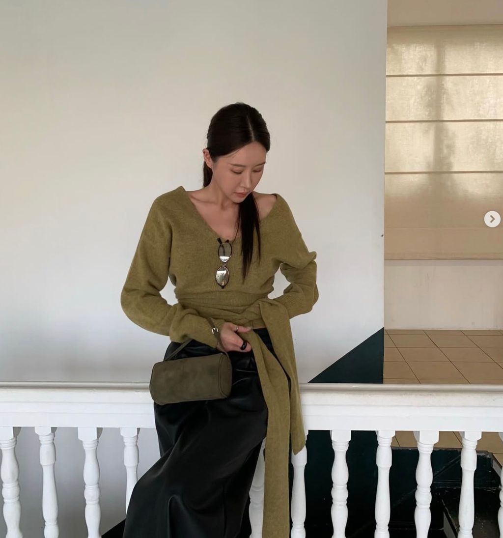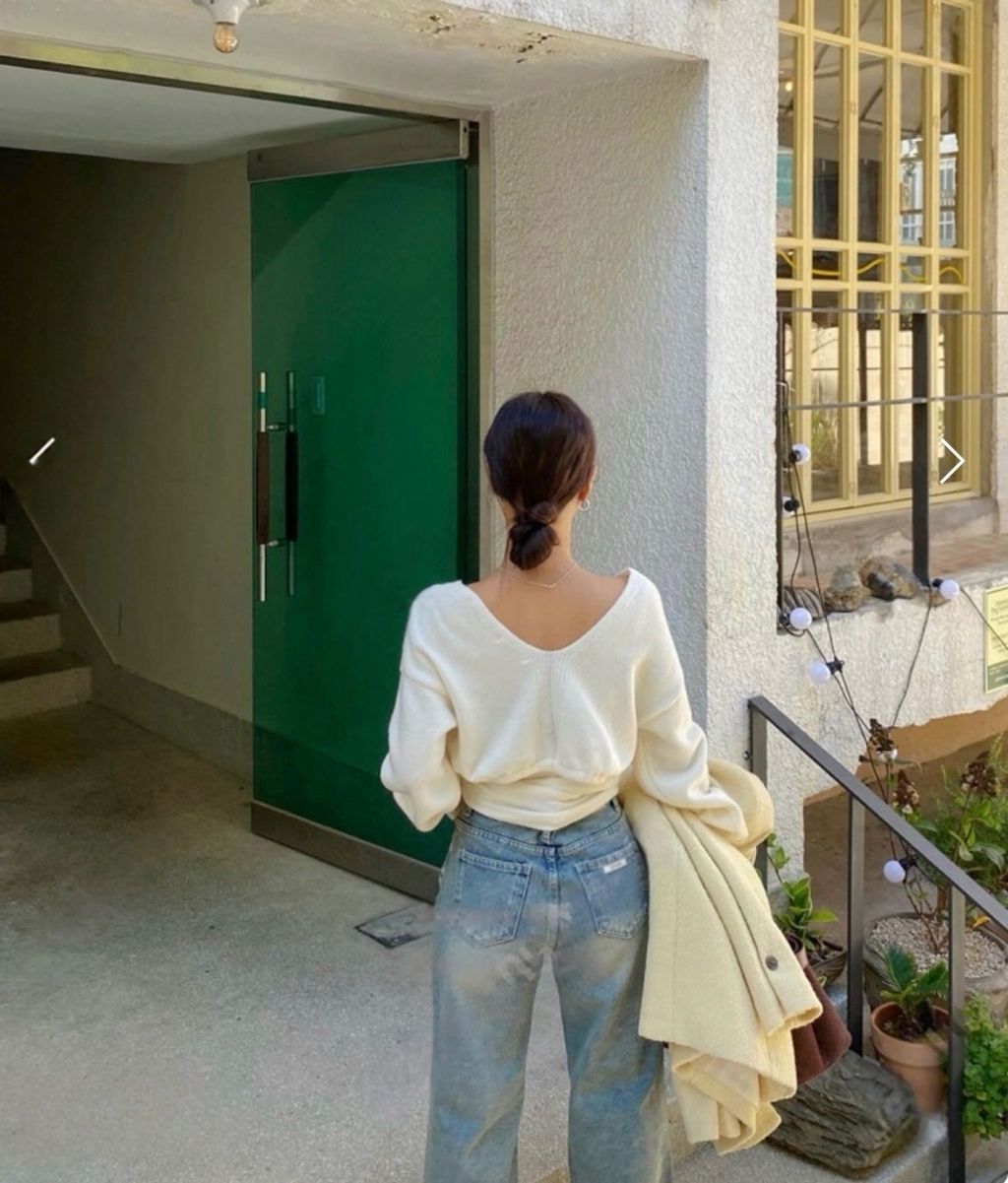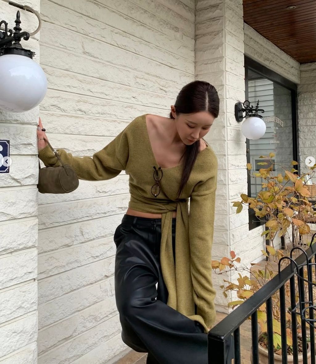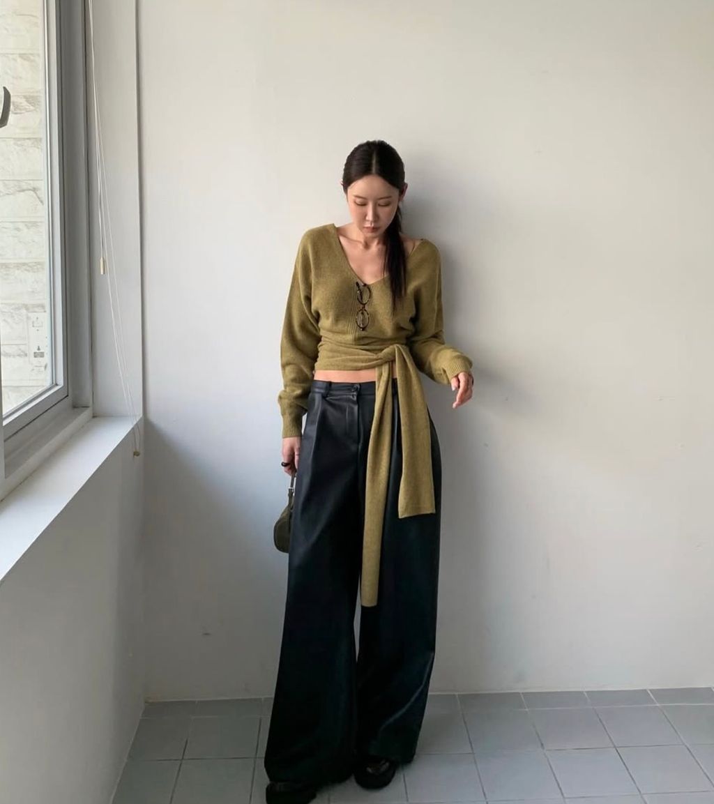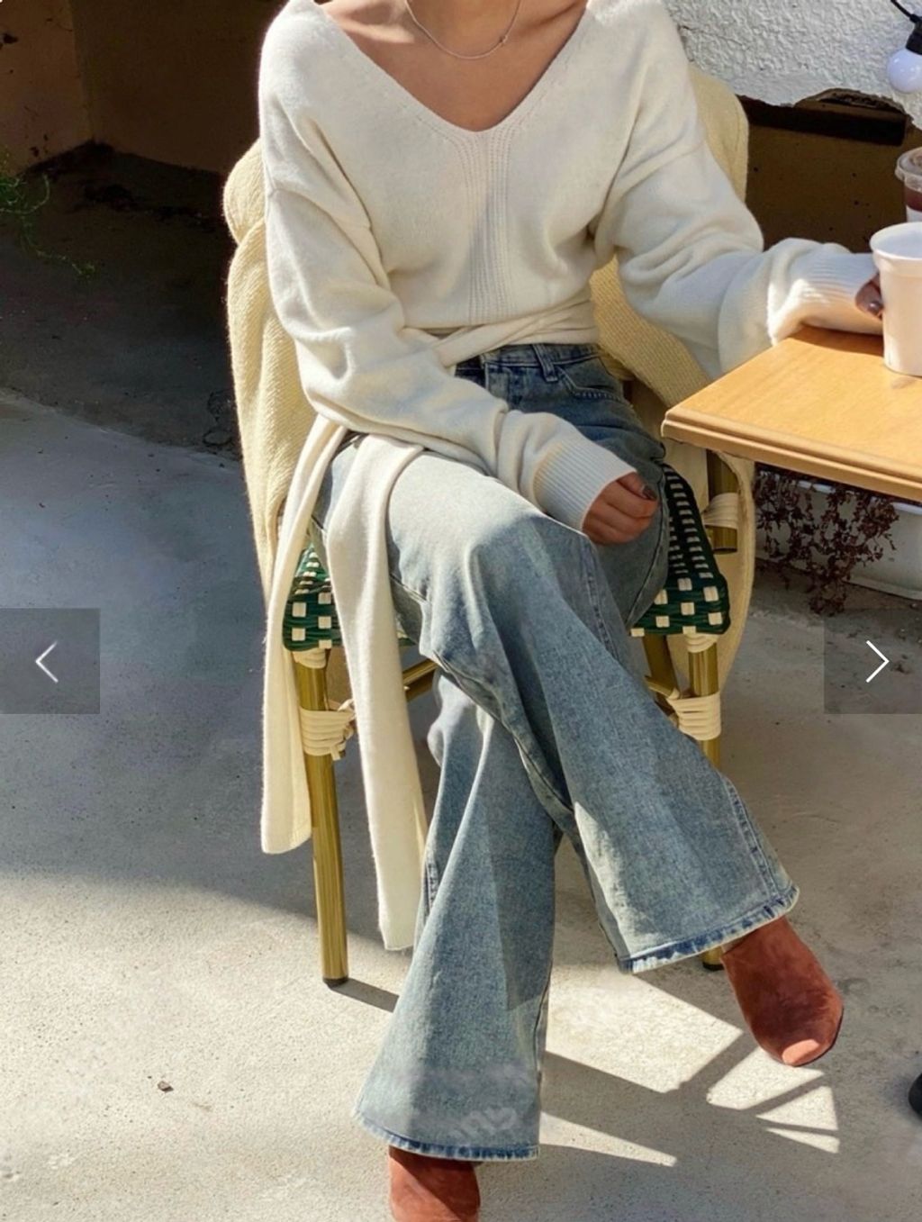 江南風格 下擺綁帶 深V領 針織衫 三色