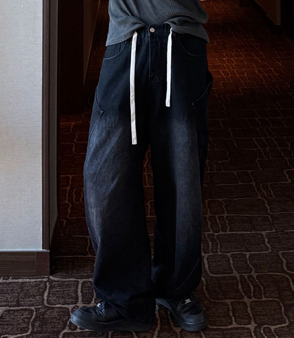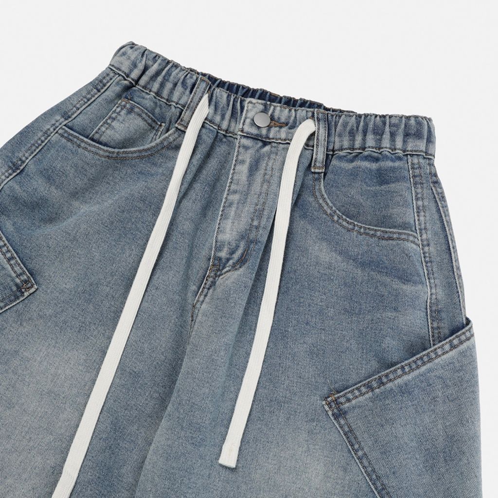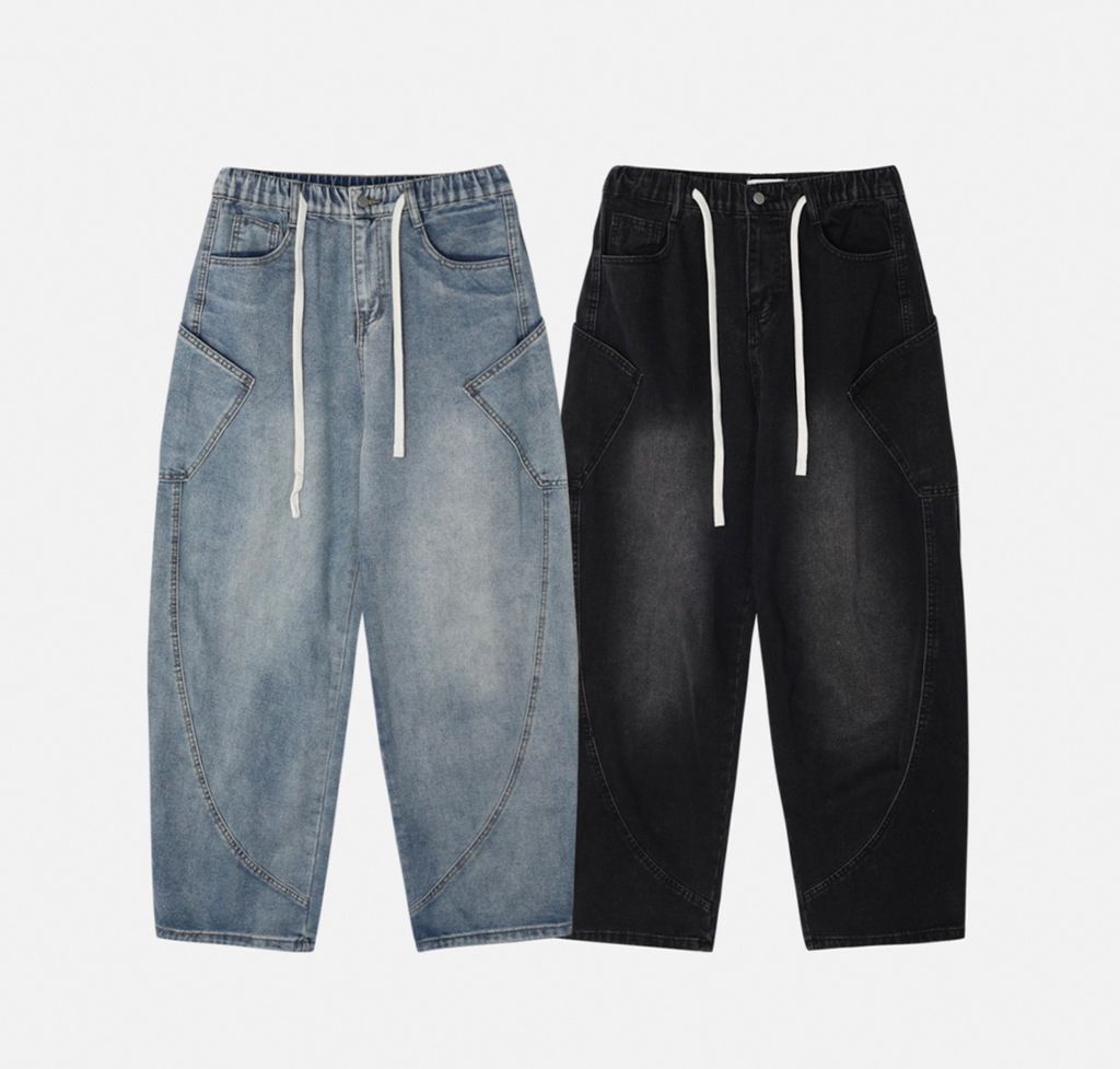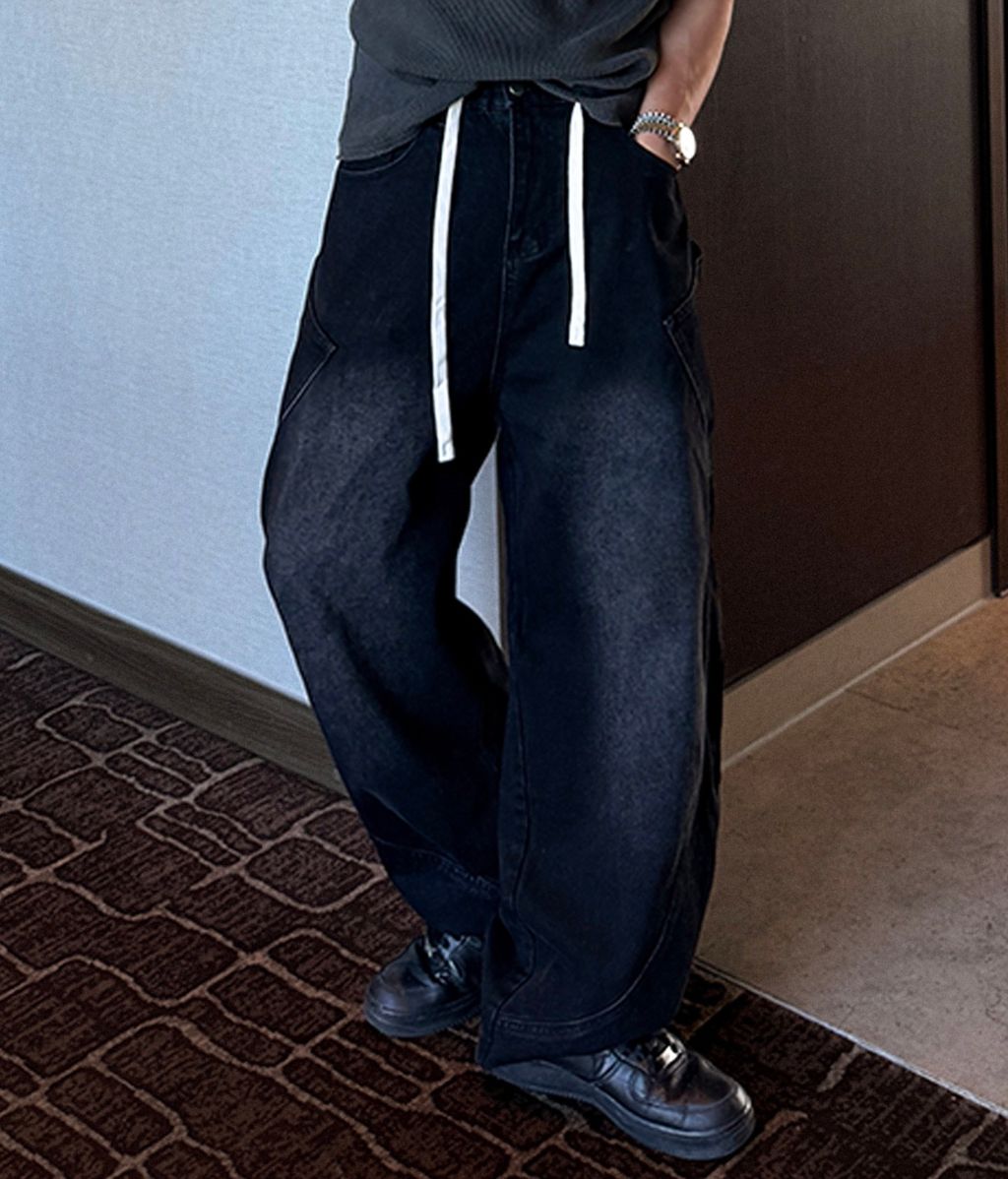 鬆緊綁帶抽繩 拼接口袋 做舊刷色 微寬管牛仔褲 兩色