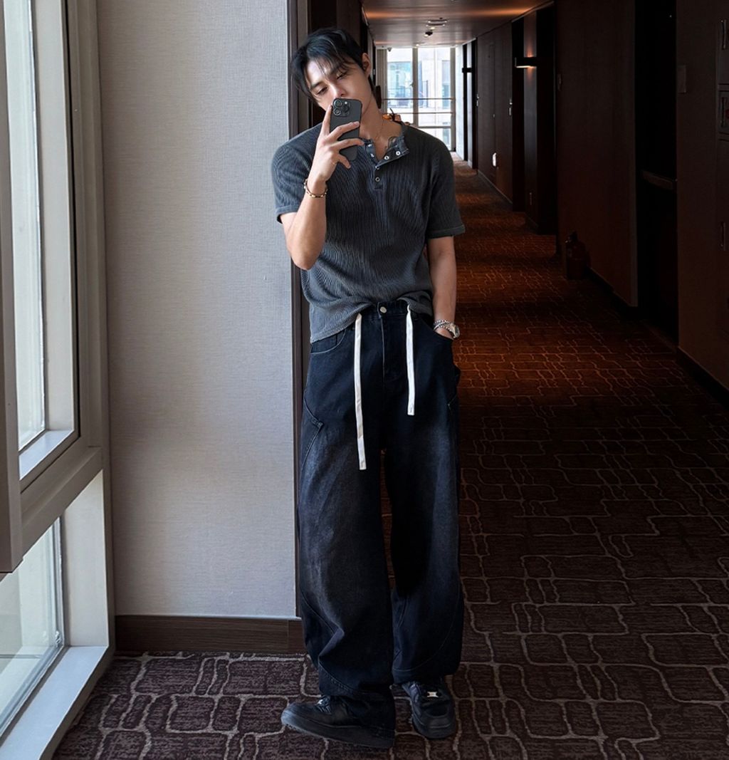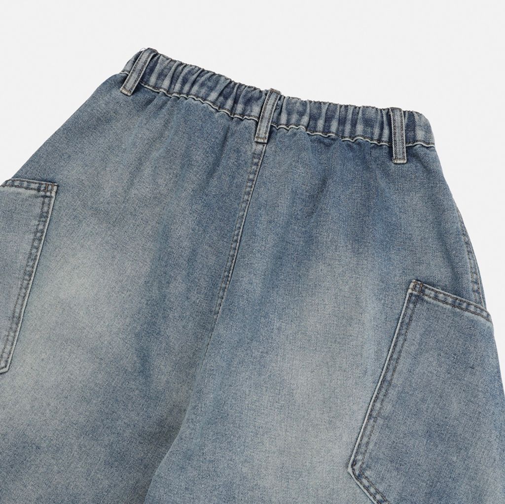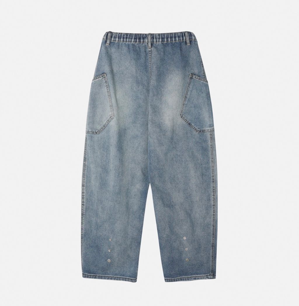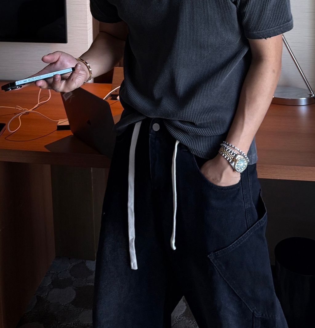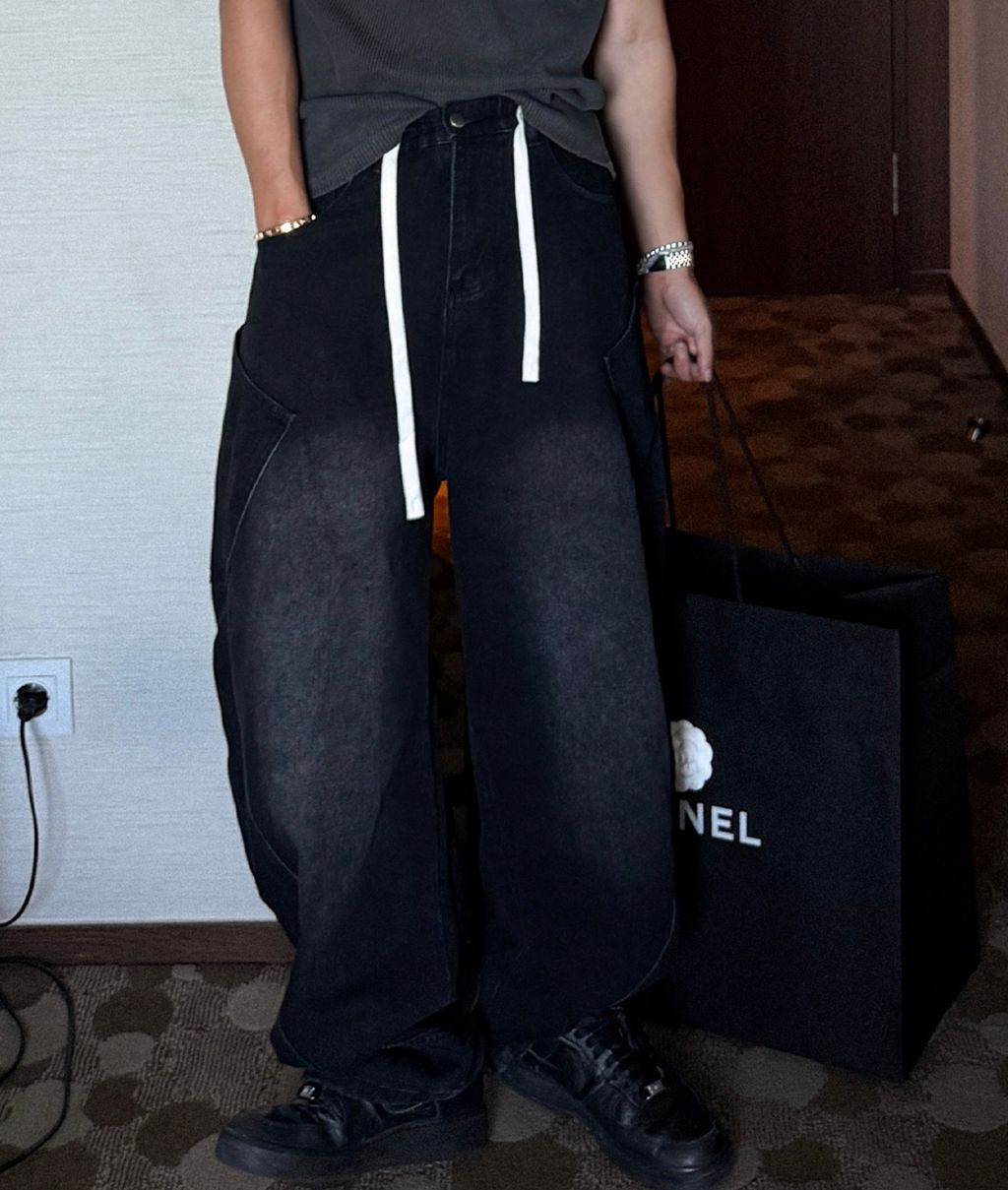 鬆緊綁帶抽繩 拼接口袋 做舊刷色 微寬管牛仔褲 兩色