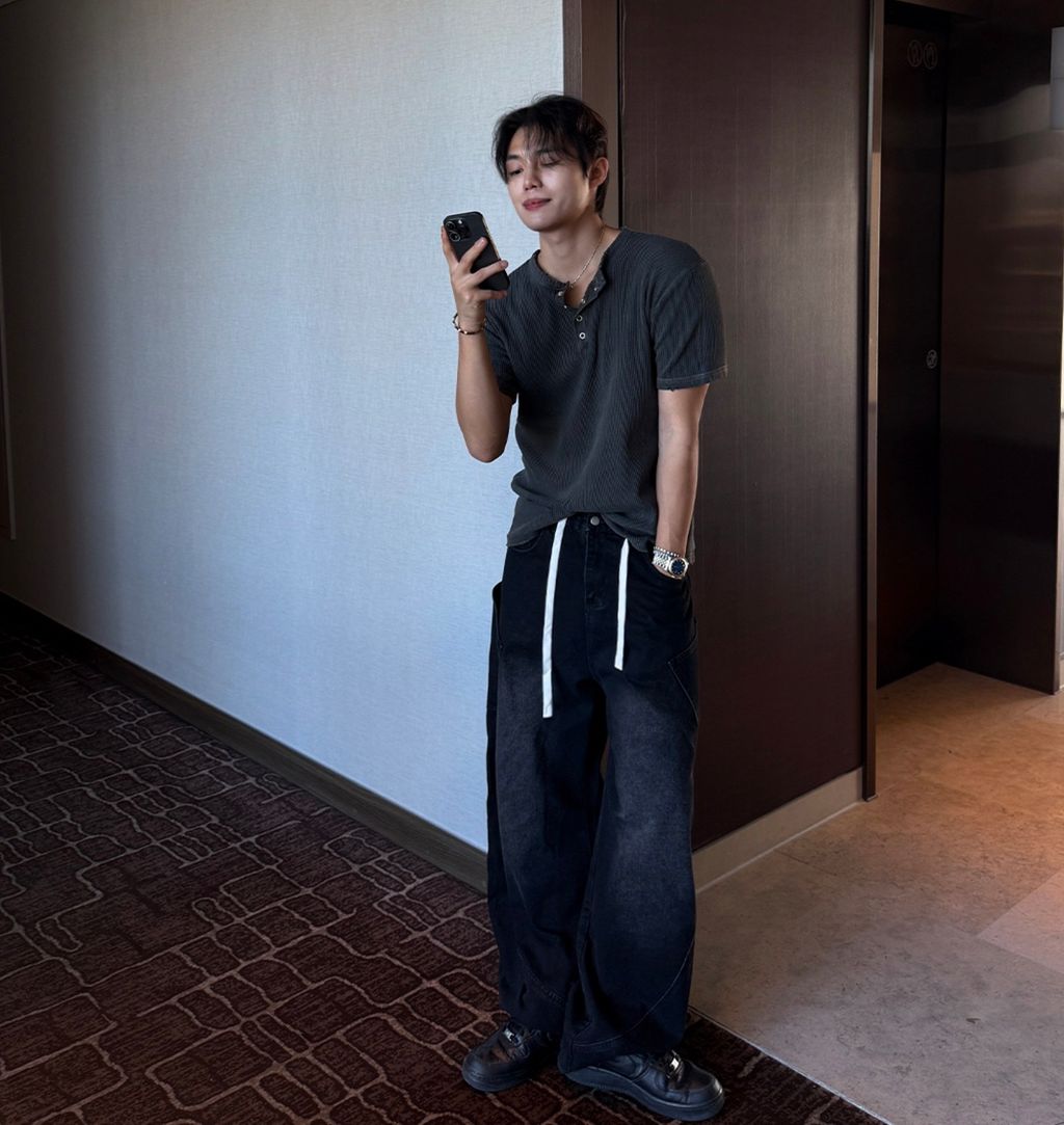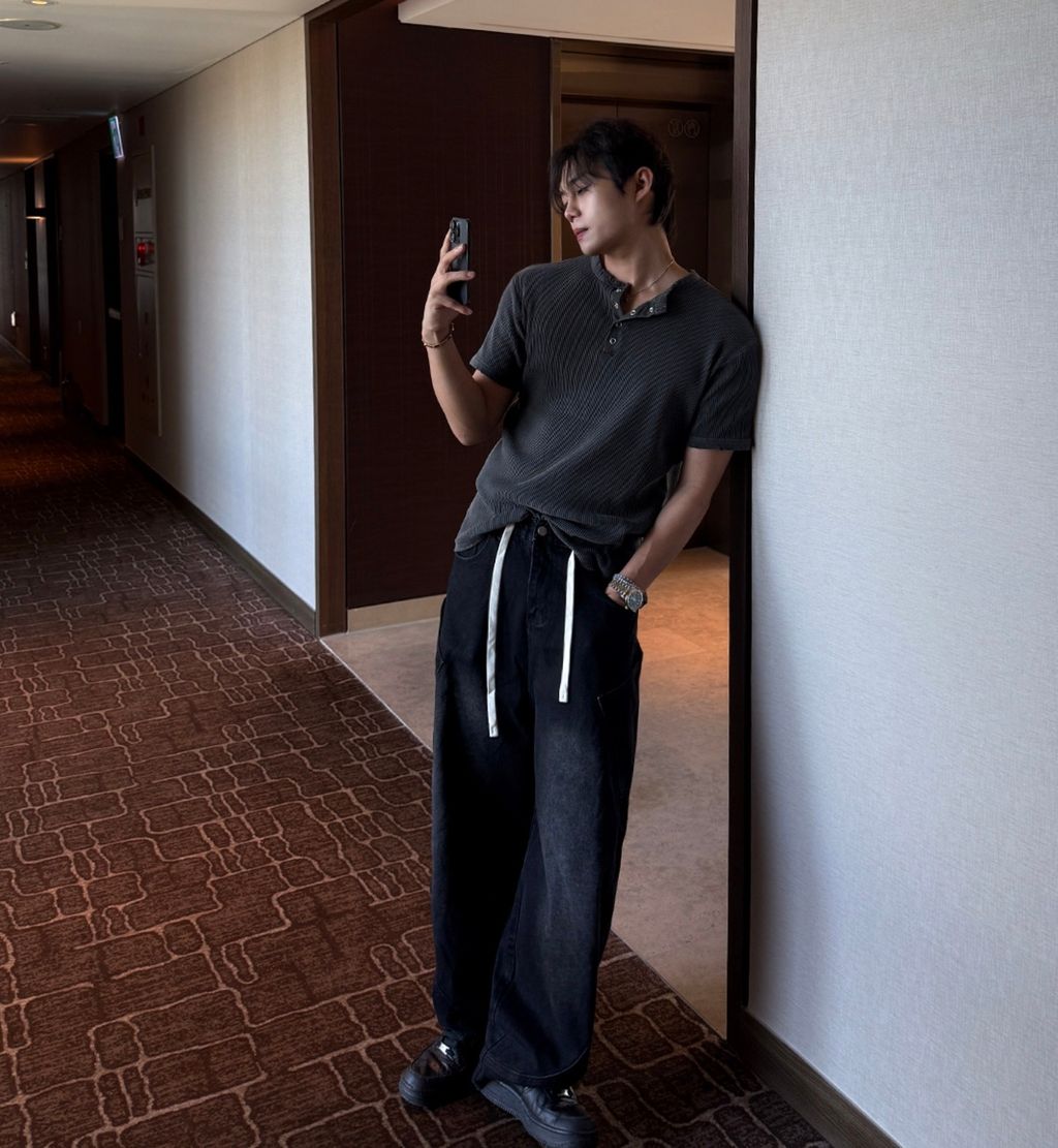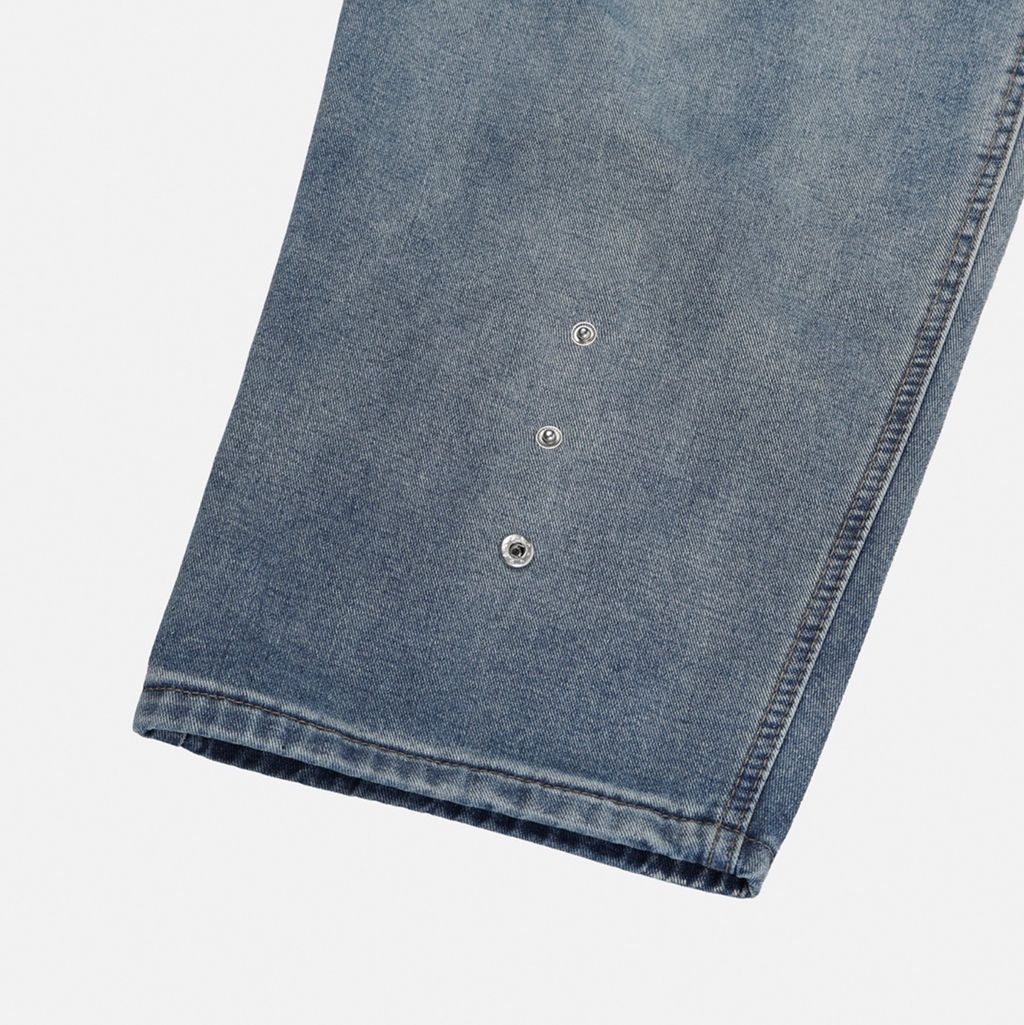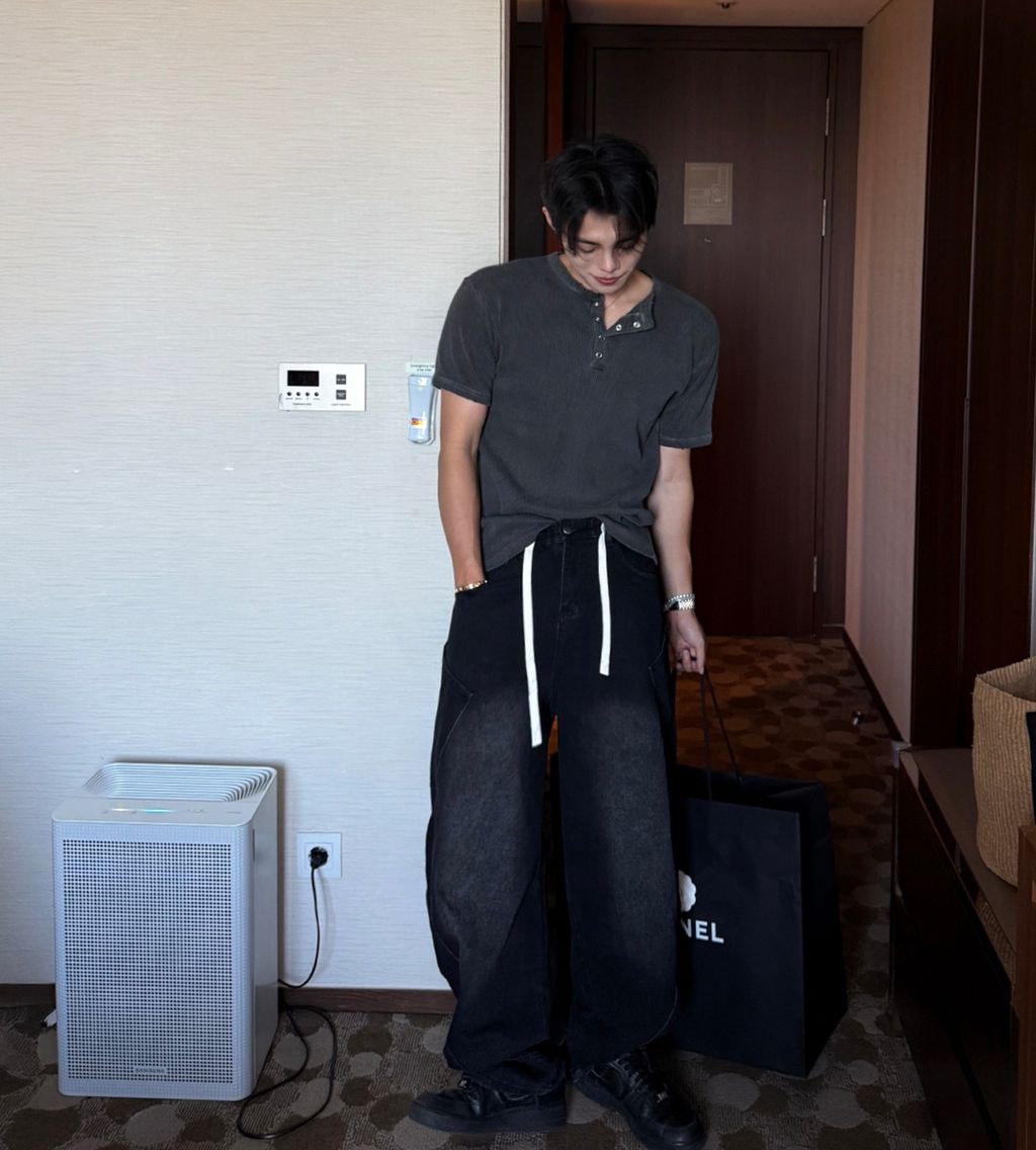 鬆緊綁帶抽繩 拼接口袋 做舊刷色 微寬管牛仔褲 兩色