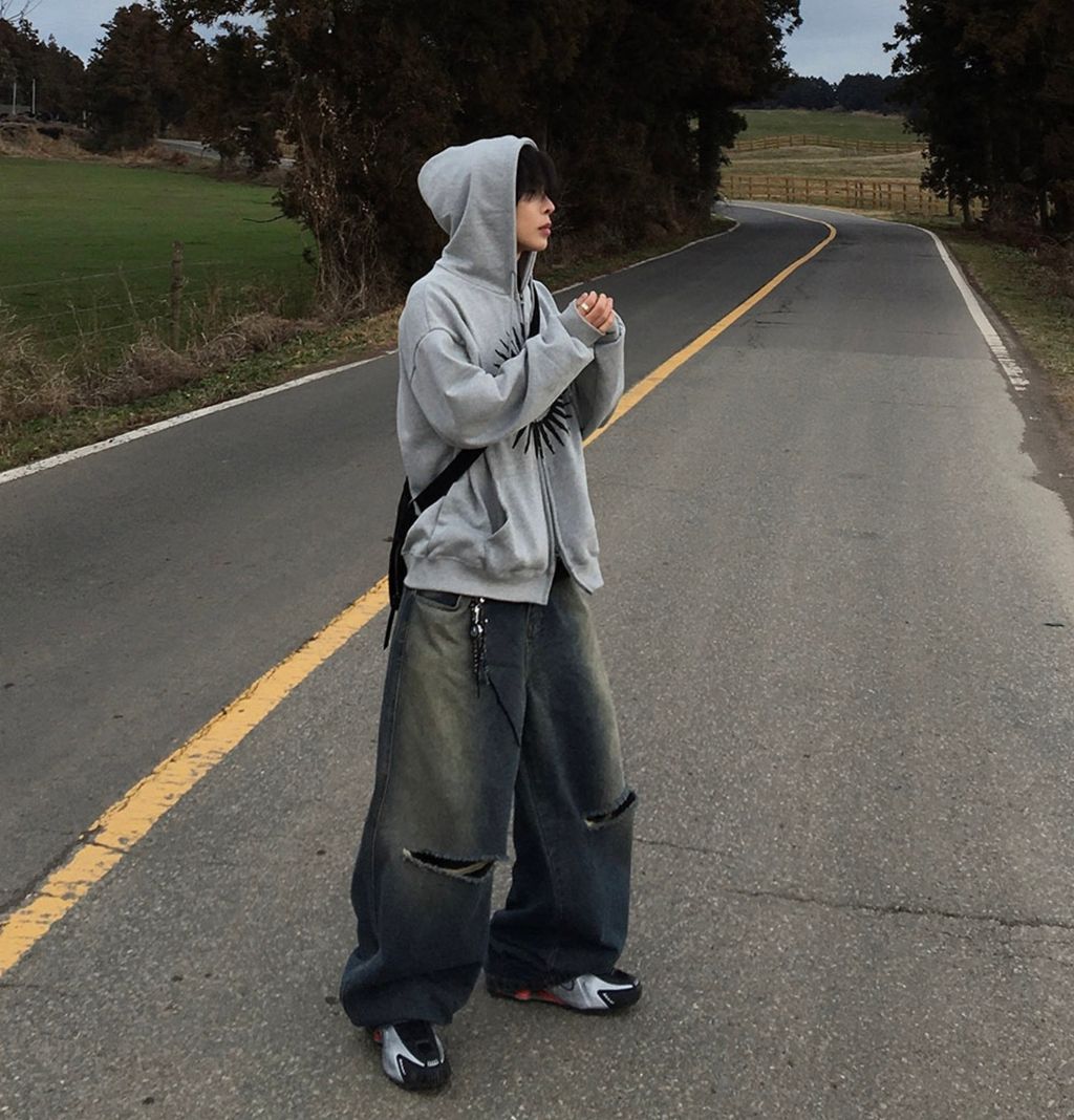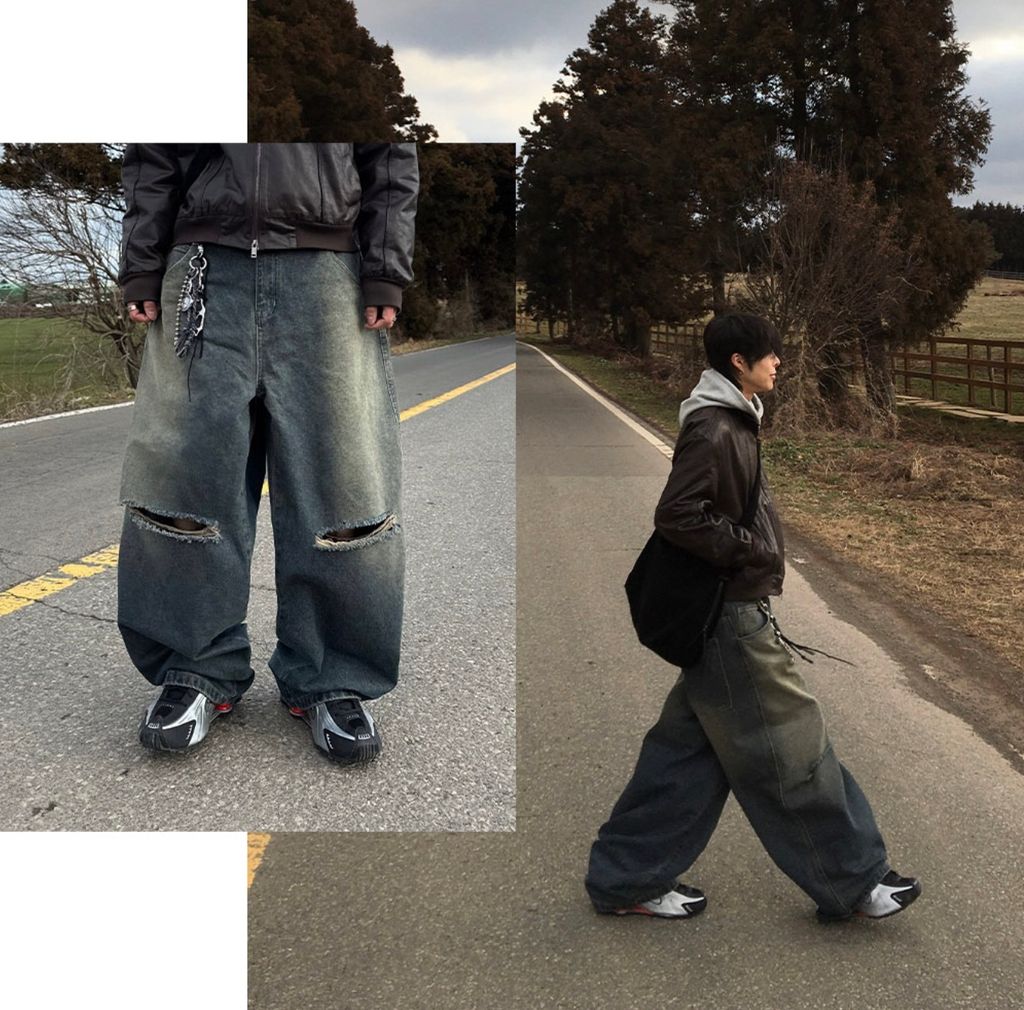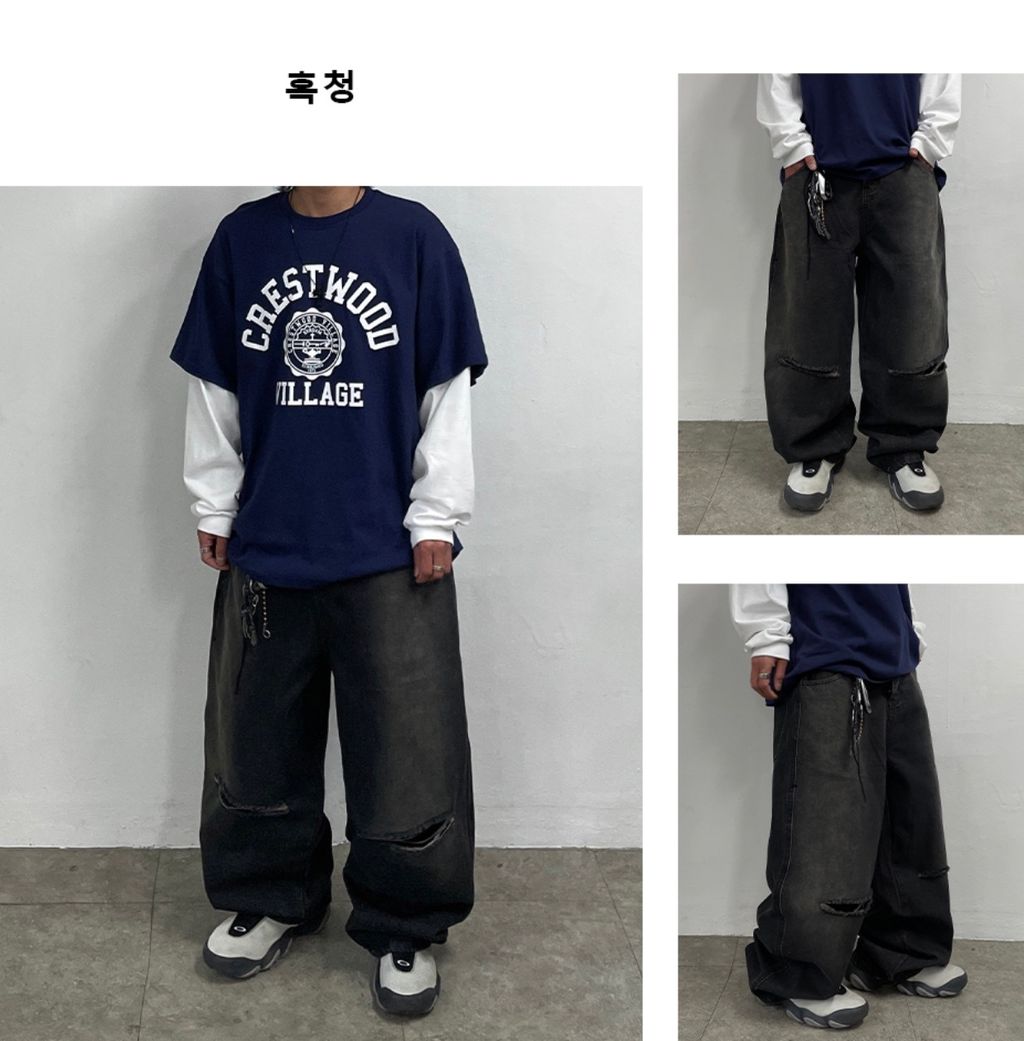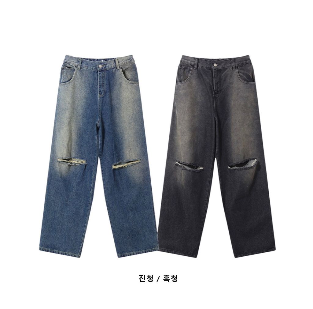 大腿刷白 膝蓋割破 寬管 彎刀 單寧牛仔褲 兩色