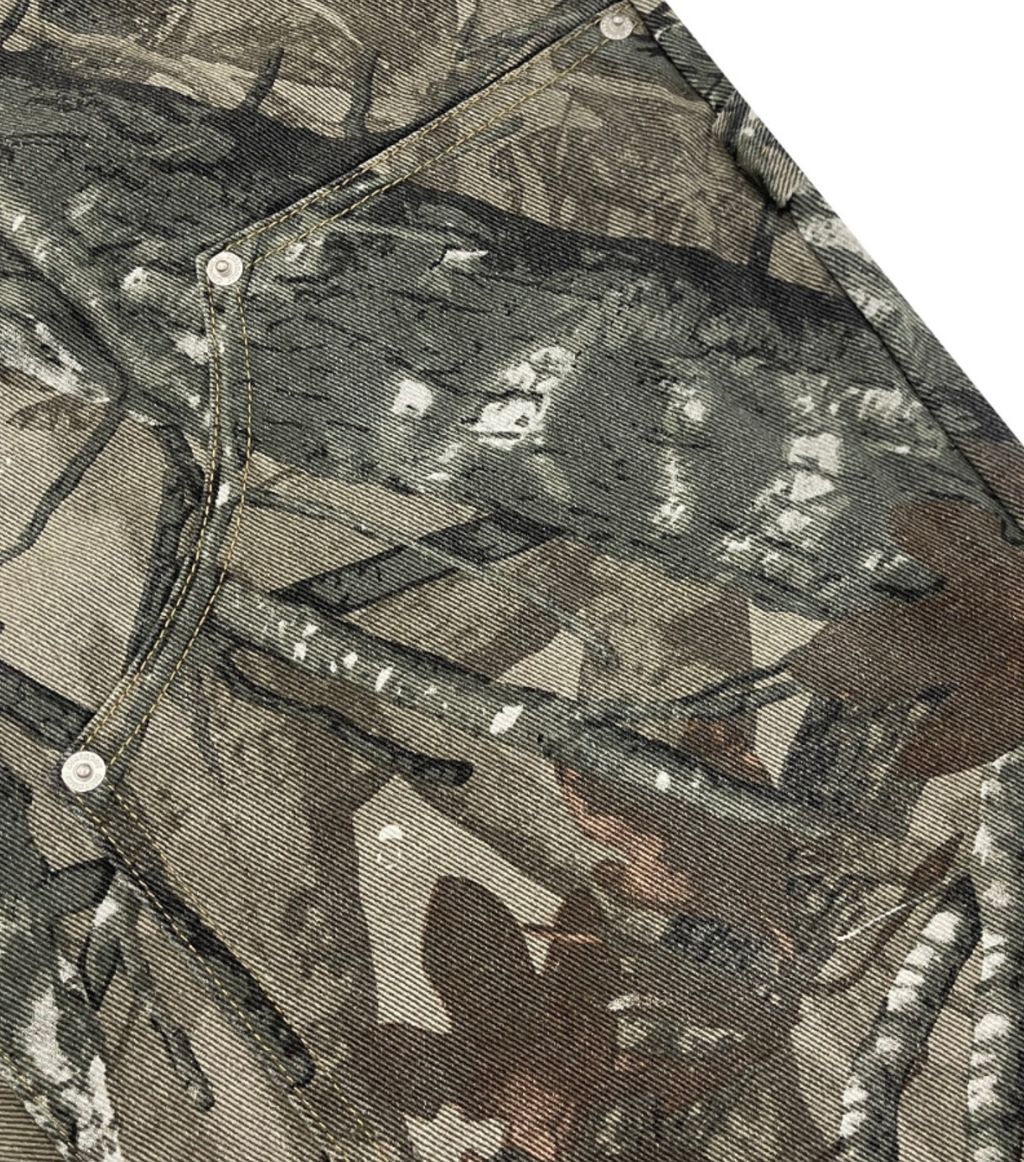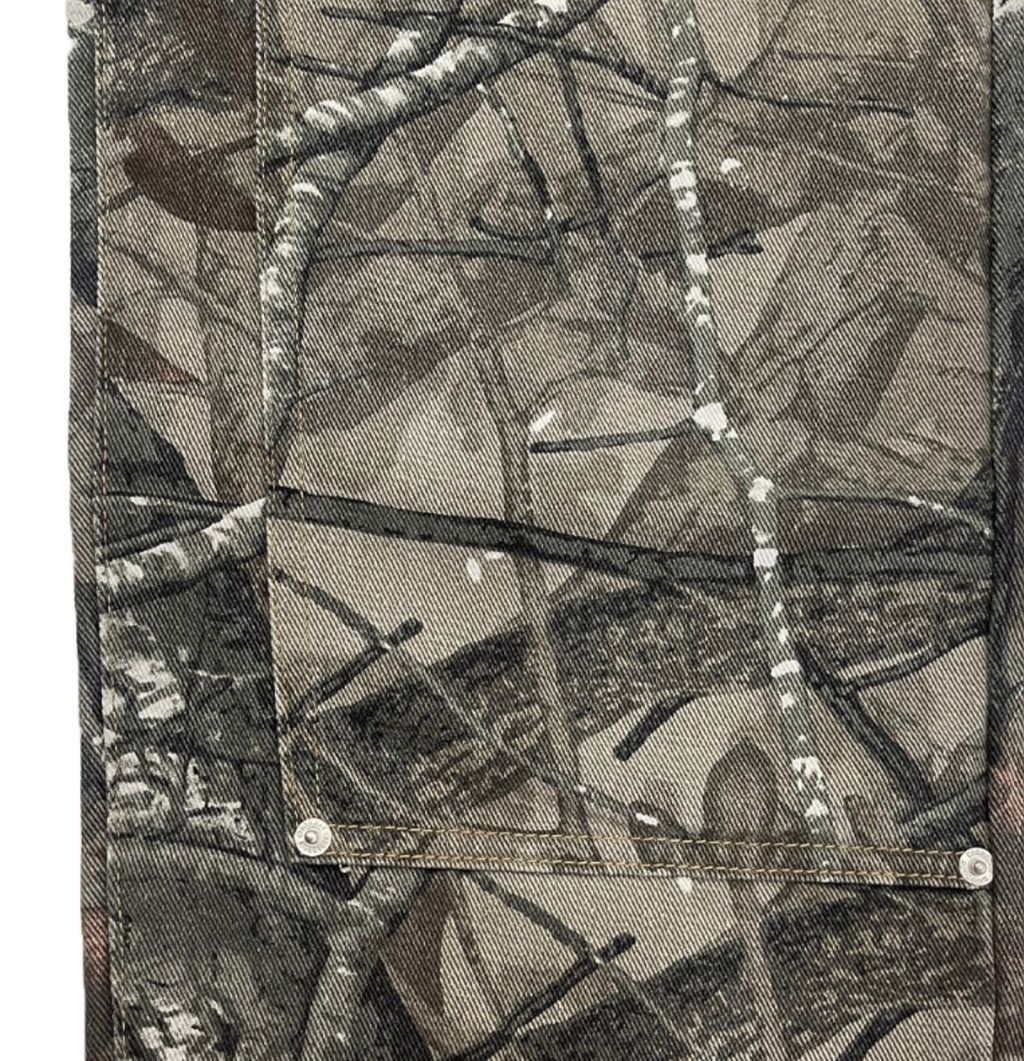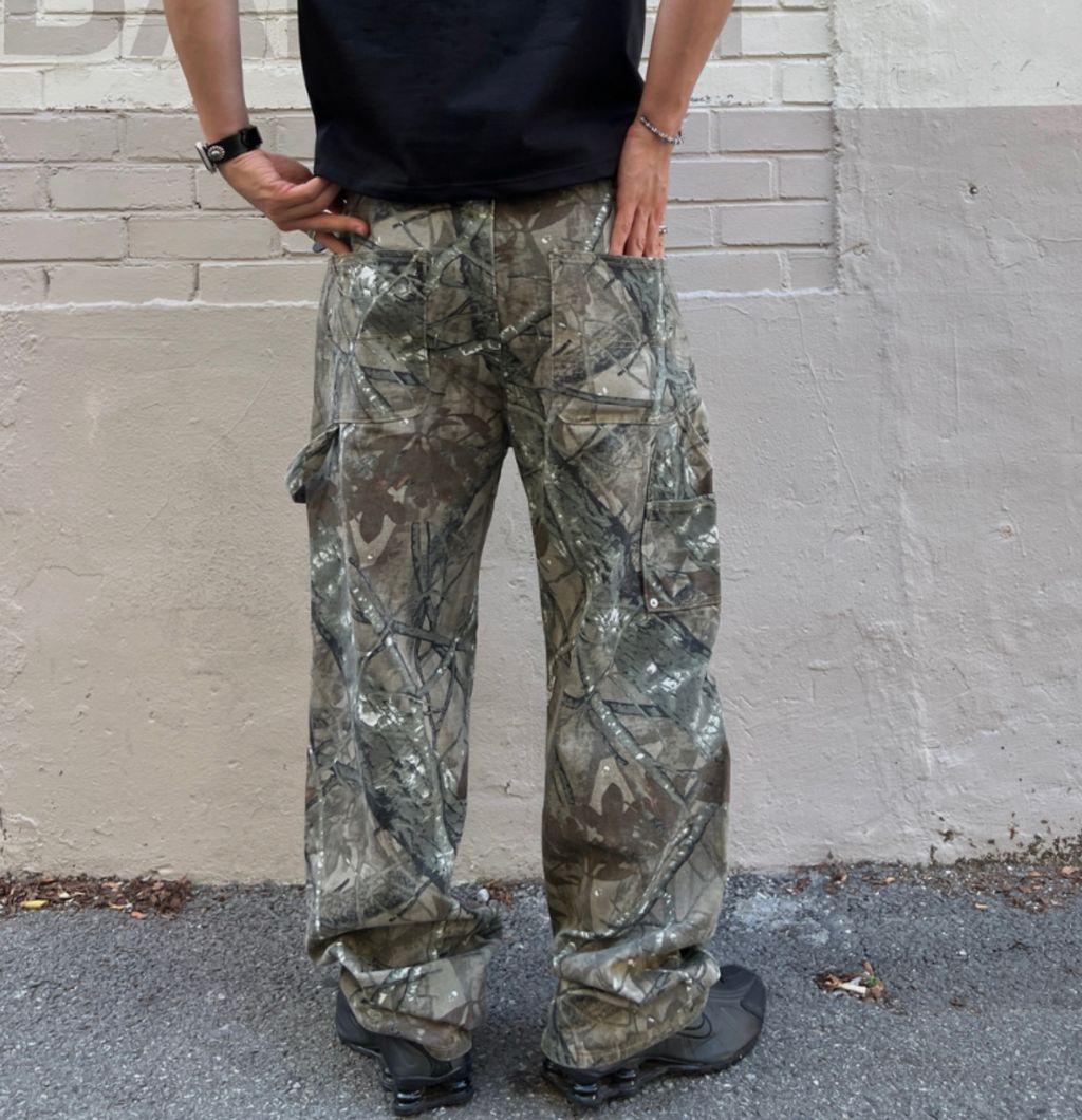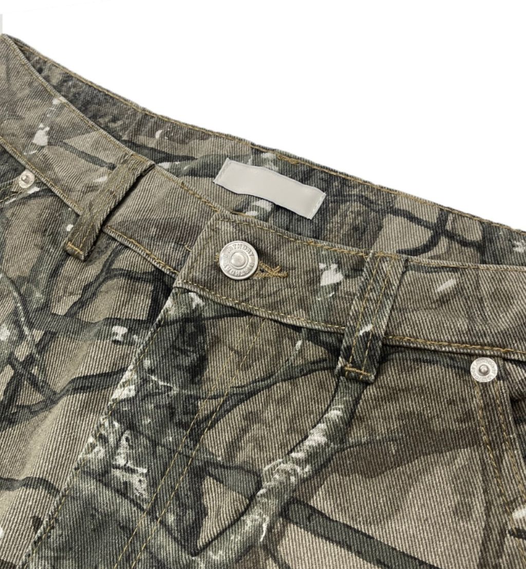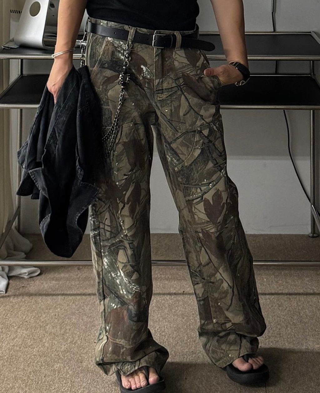 枯木紋路迷彩花紋 小寬管 單寧牛仔 工裝長褲