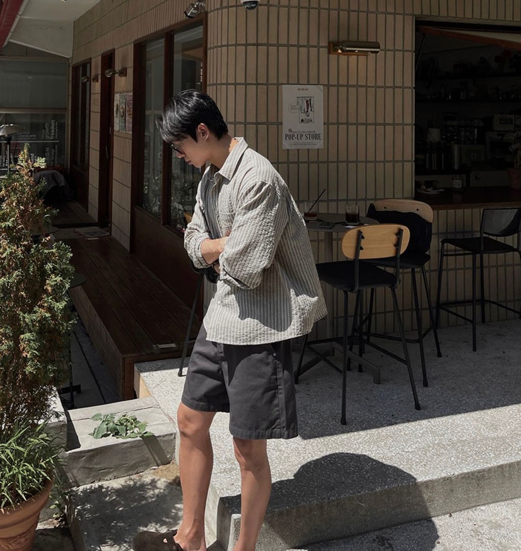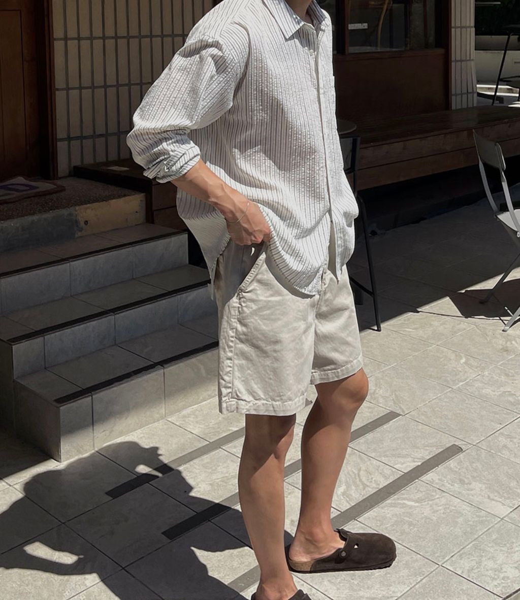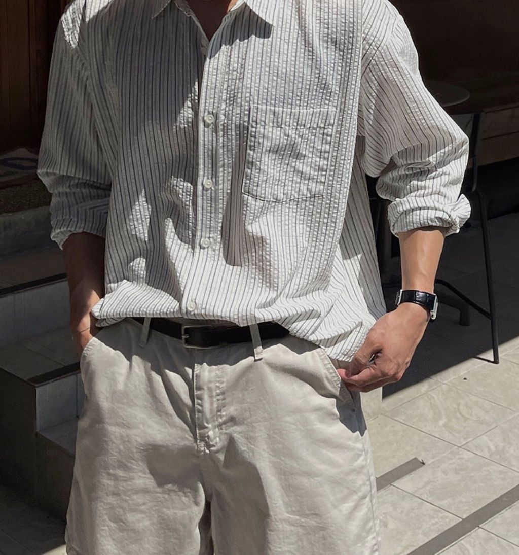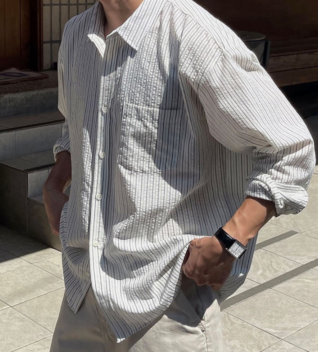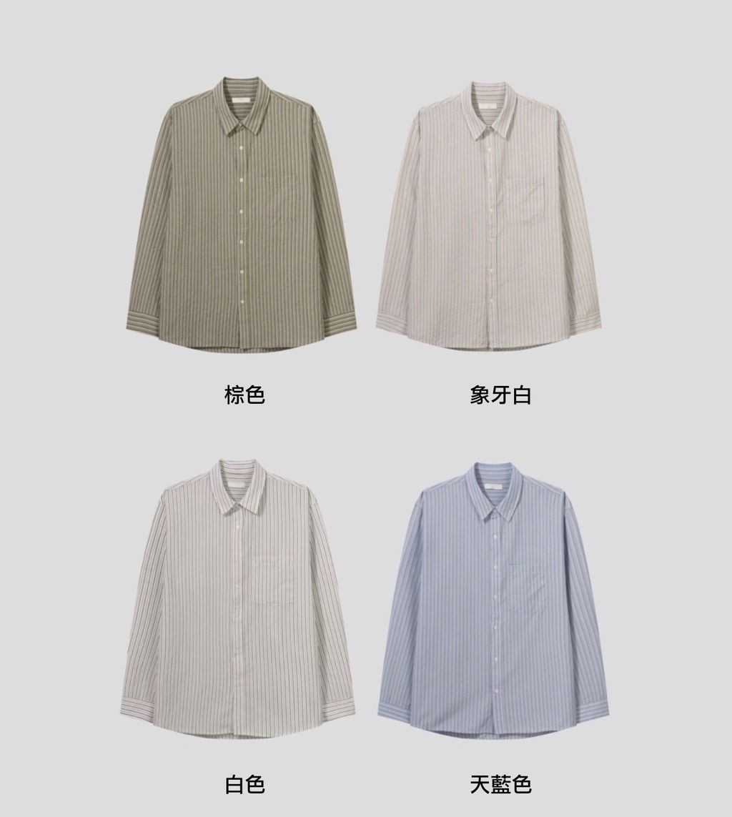 皺褶布料 直條紋 渡假風長袖薄款襯衫 四色