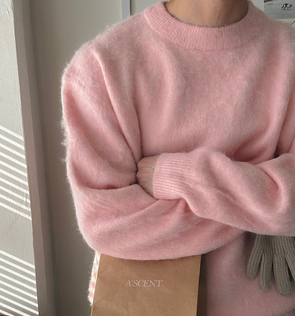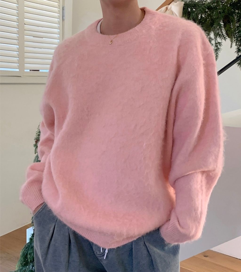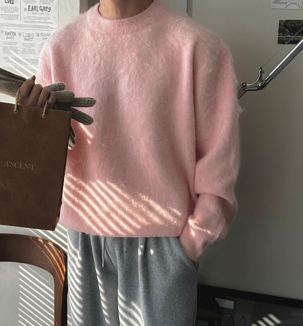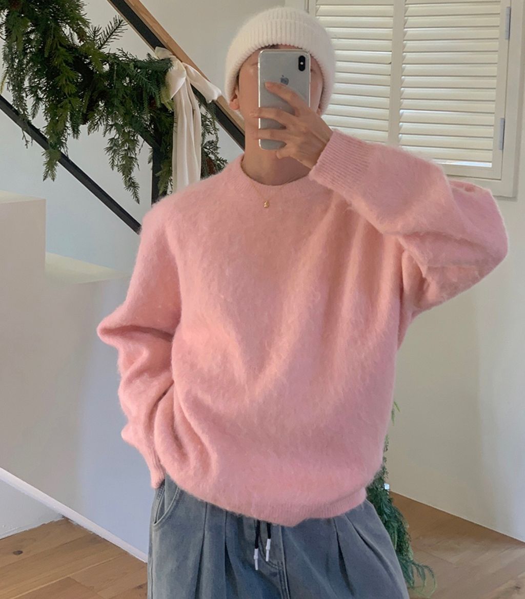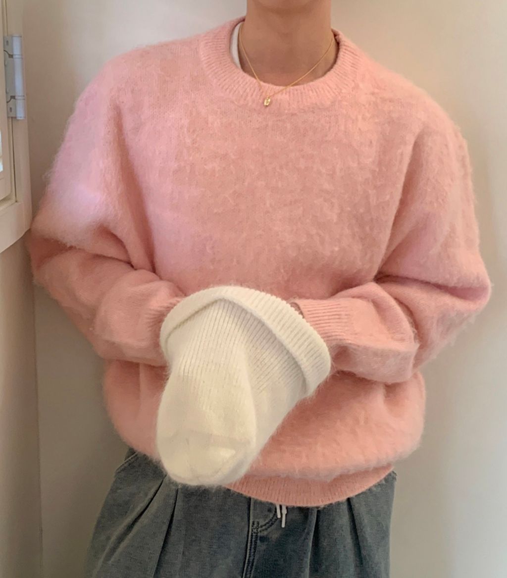 粉嫩粉嫩絨毛落肩寬鬆長袖針織衫毛衣 六色
