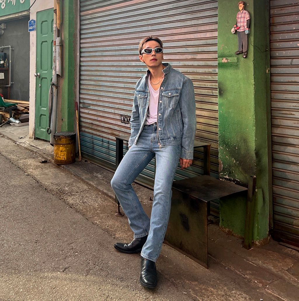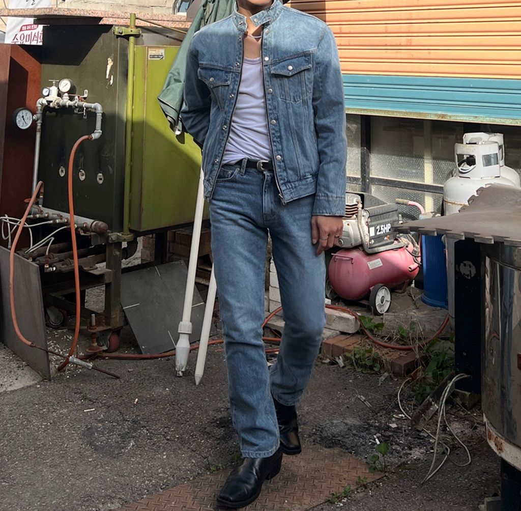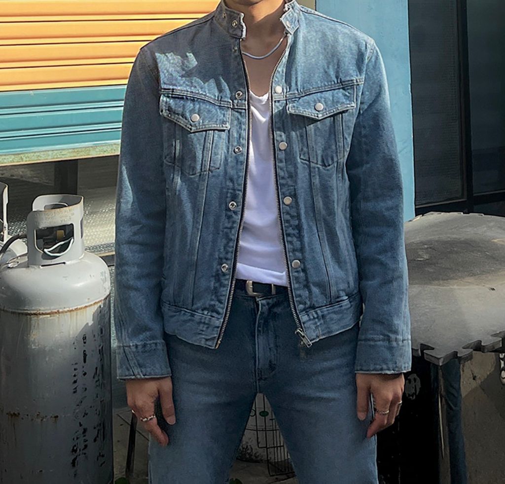 搖滾牛仔套裝 亨利領排扣雙開拉鍊外套 + 微窄管牛仔長褲 三色 92399074