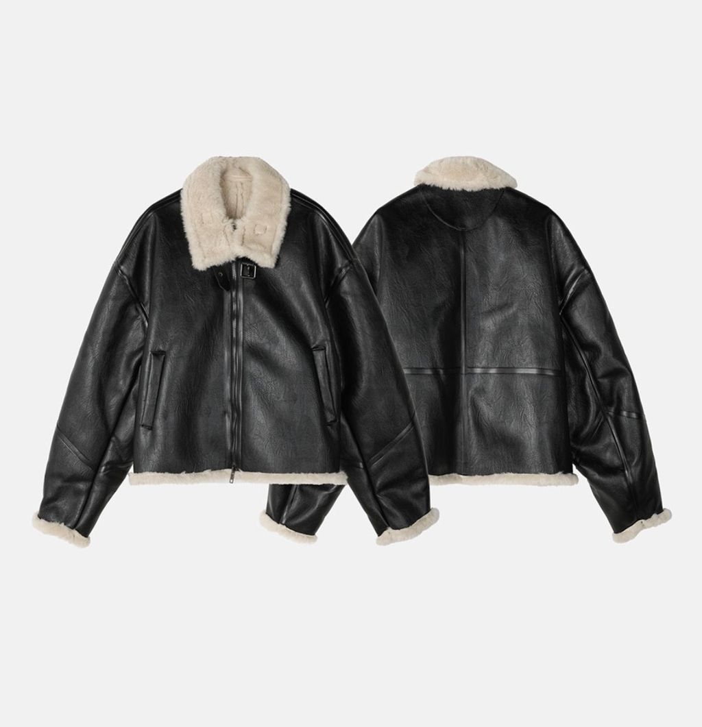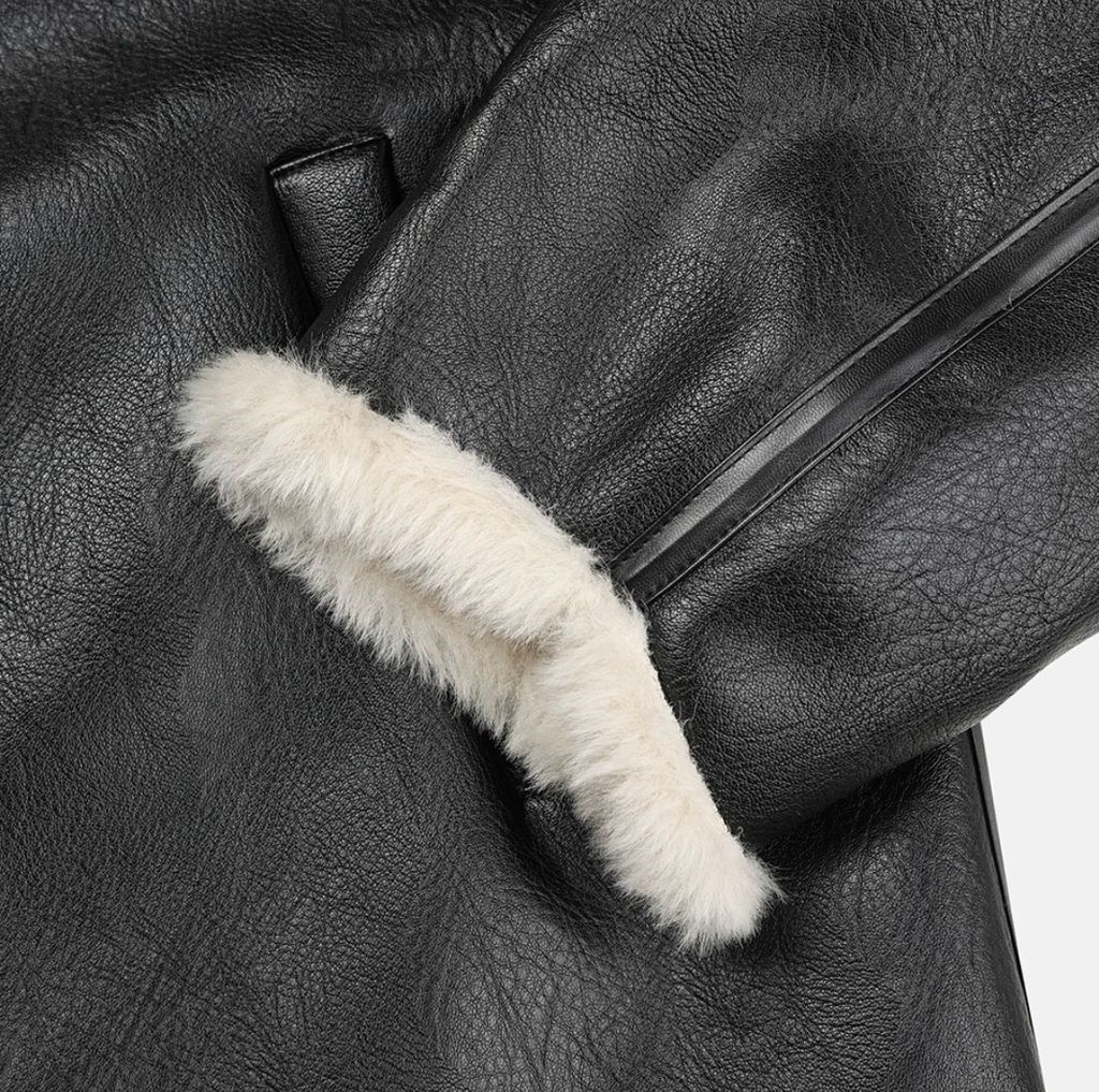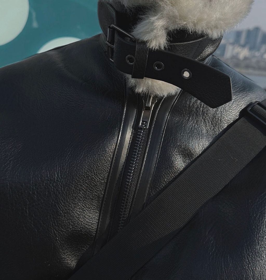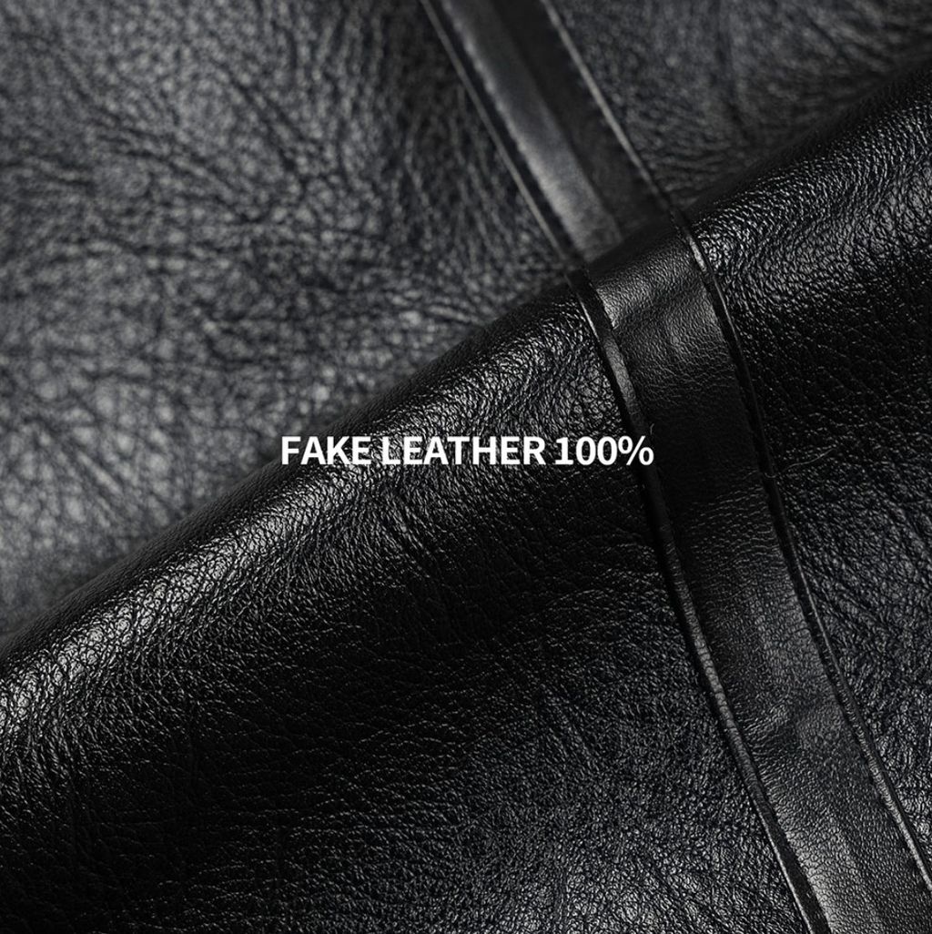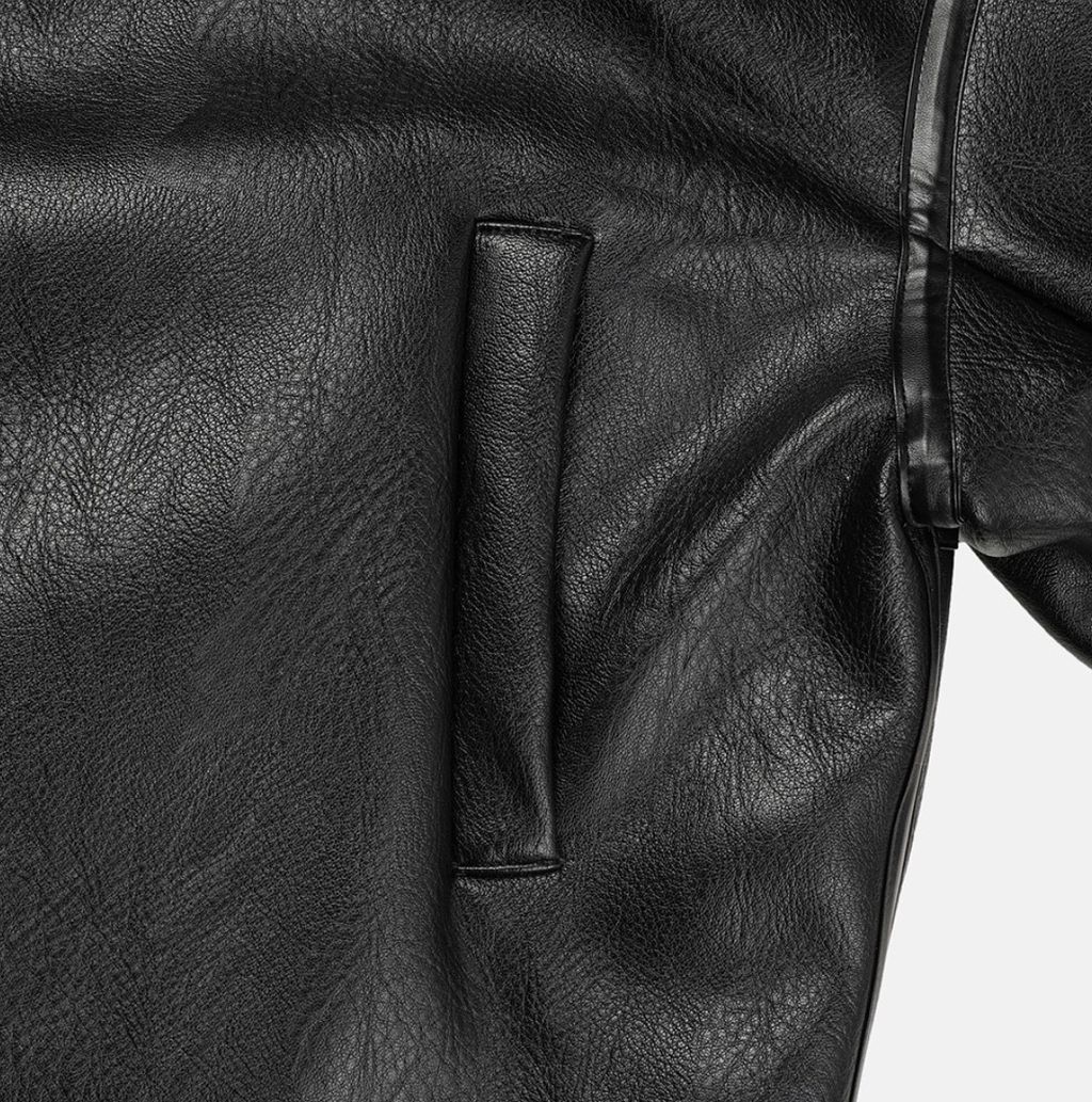 超挺人造皮革鋪毛內裏高領翻領野馬夾克 黑色