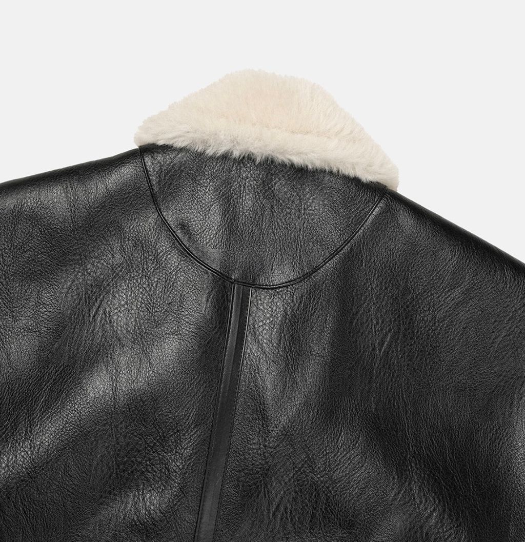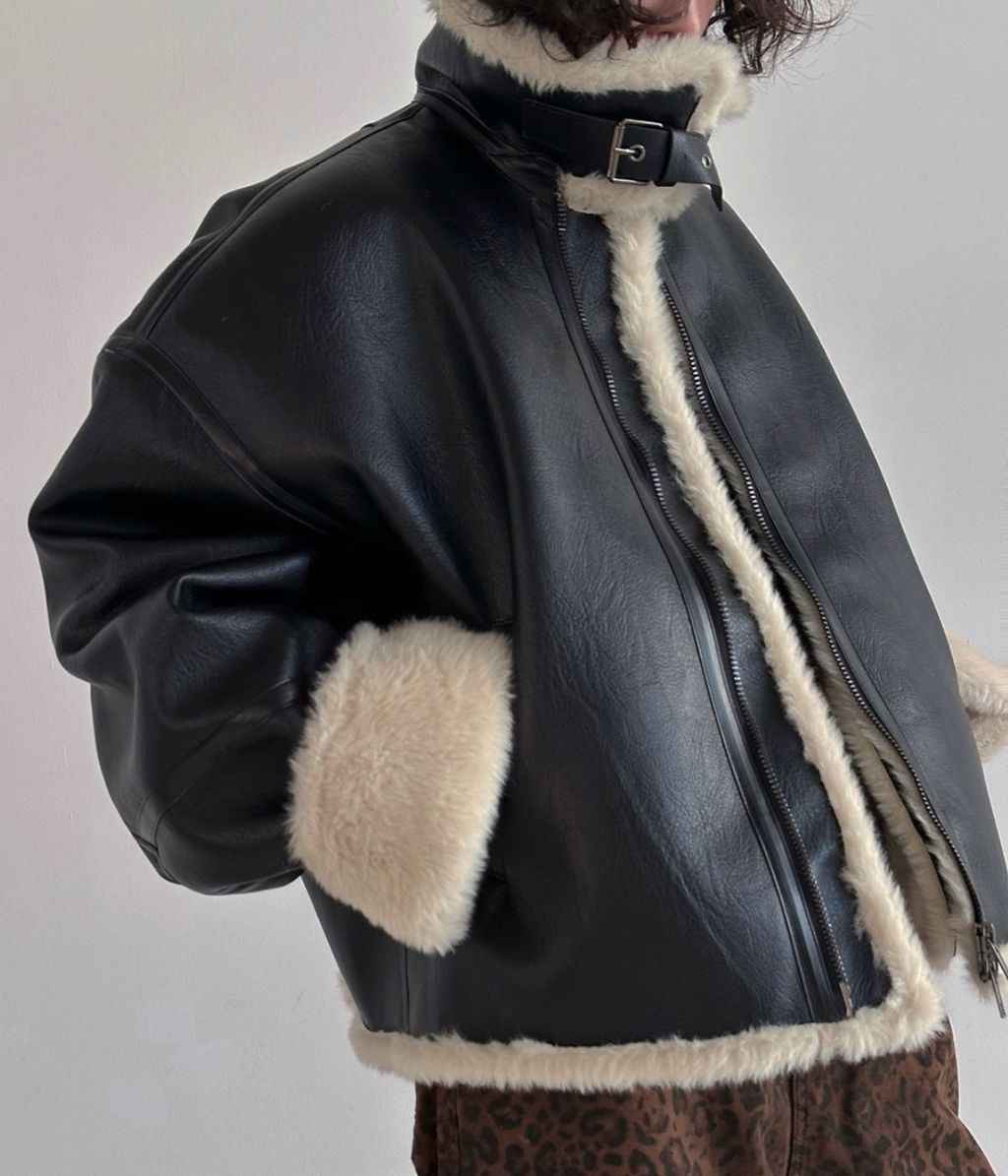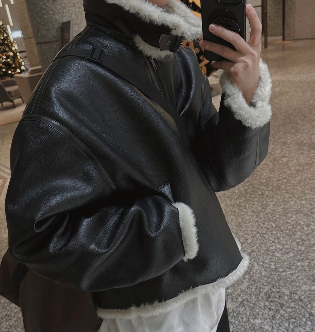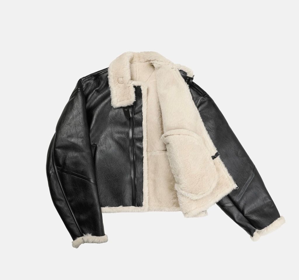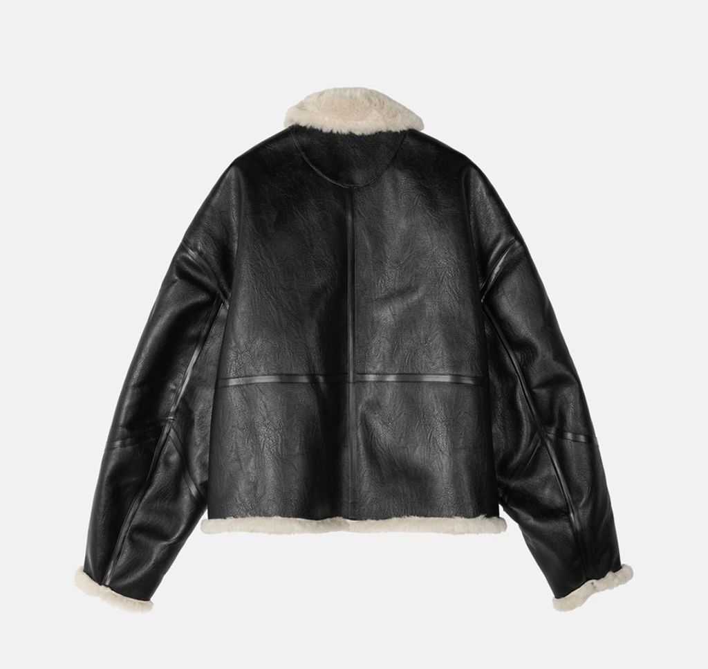 超挺人造皮革鋪毛內裏高領翻領野馬夾克 黑色
