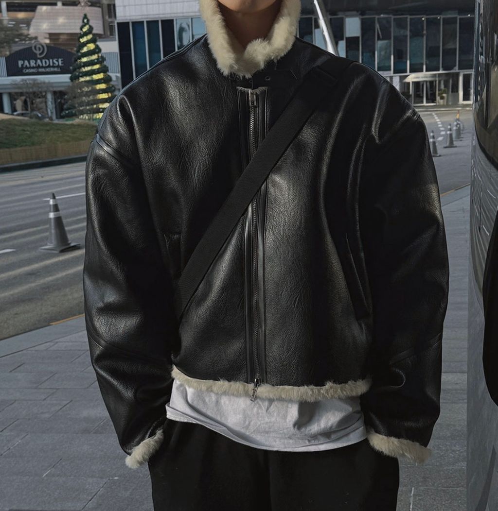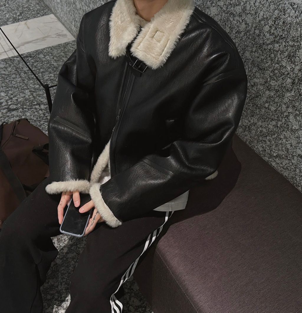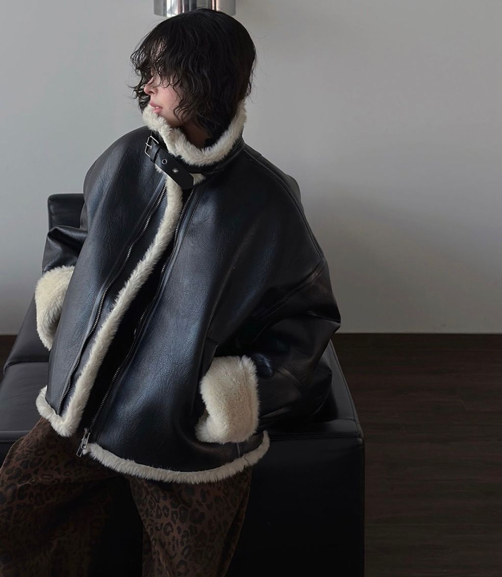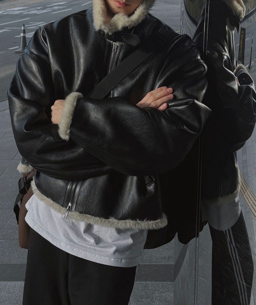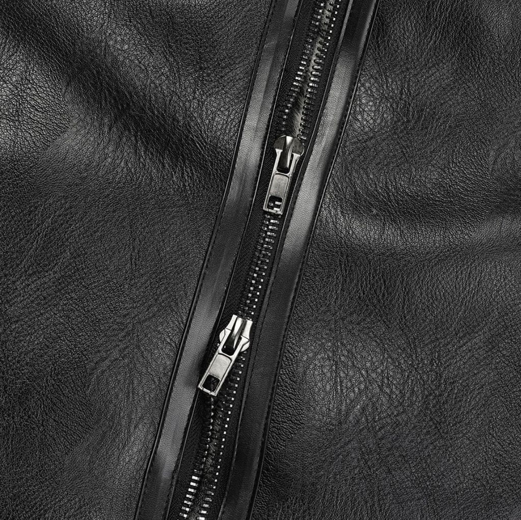 超挺人造皮革鋪毛內裏高領翻領野馬夾克 黑色