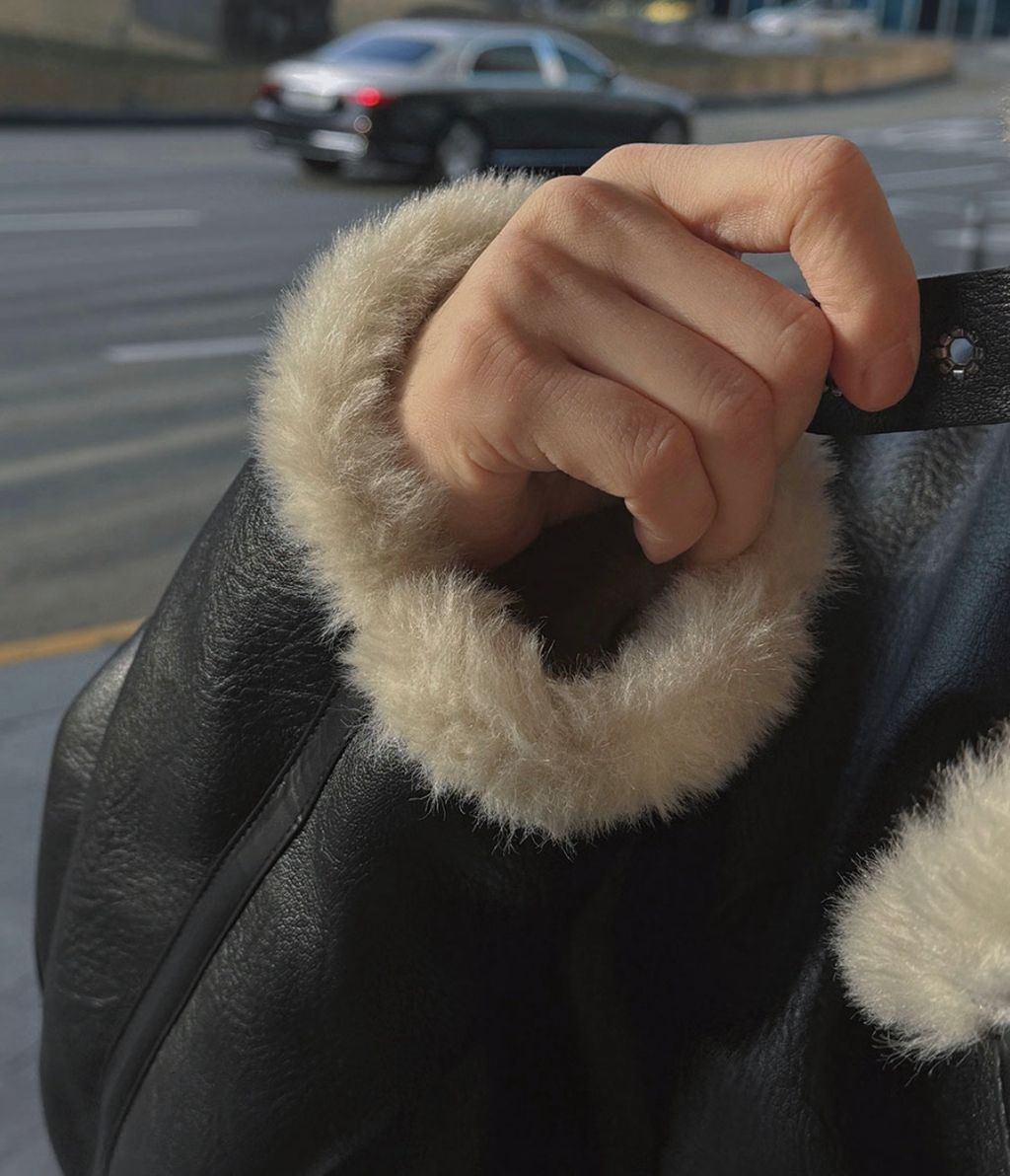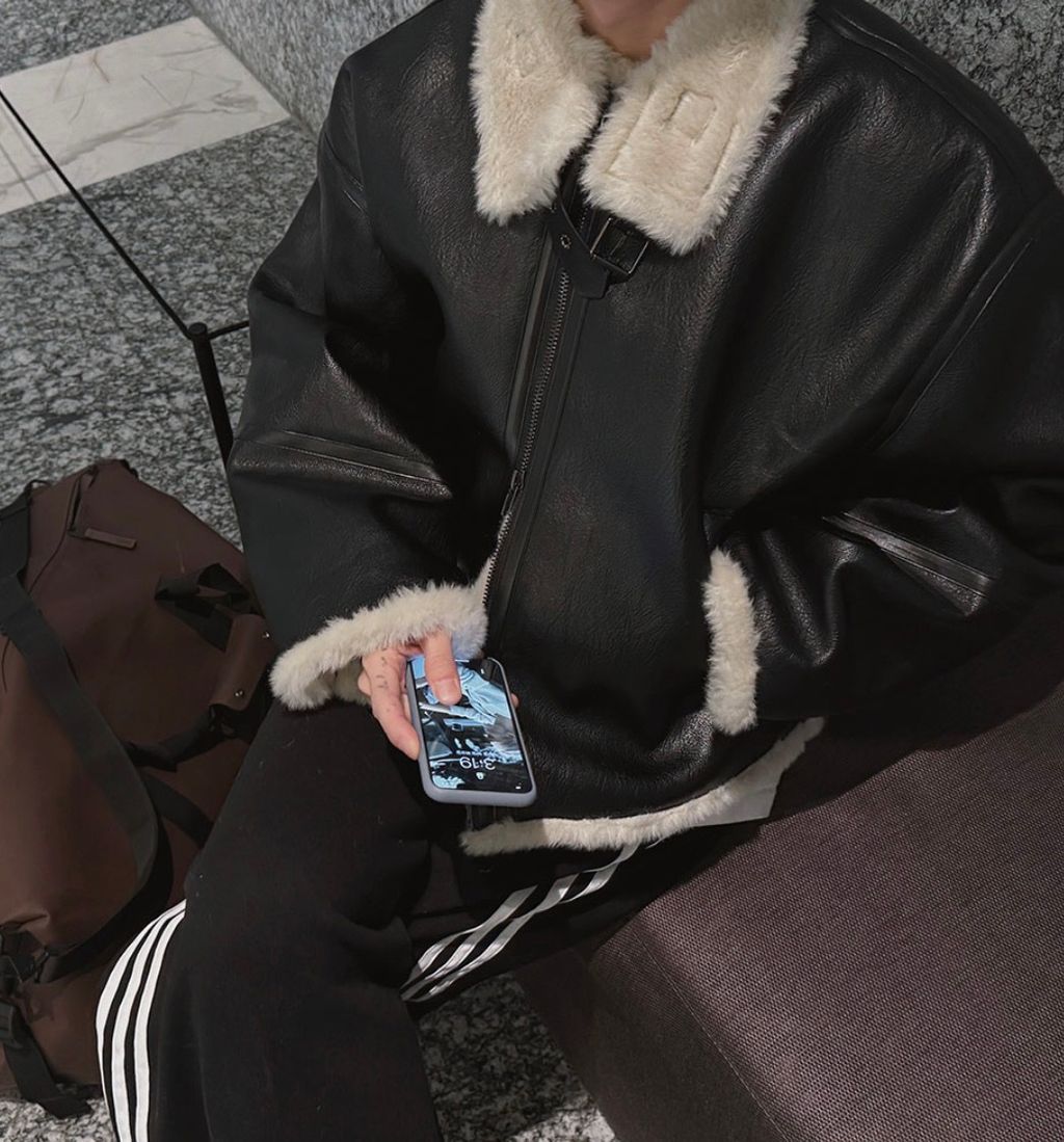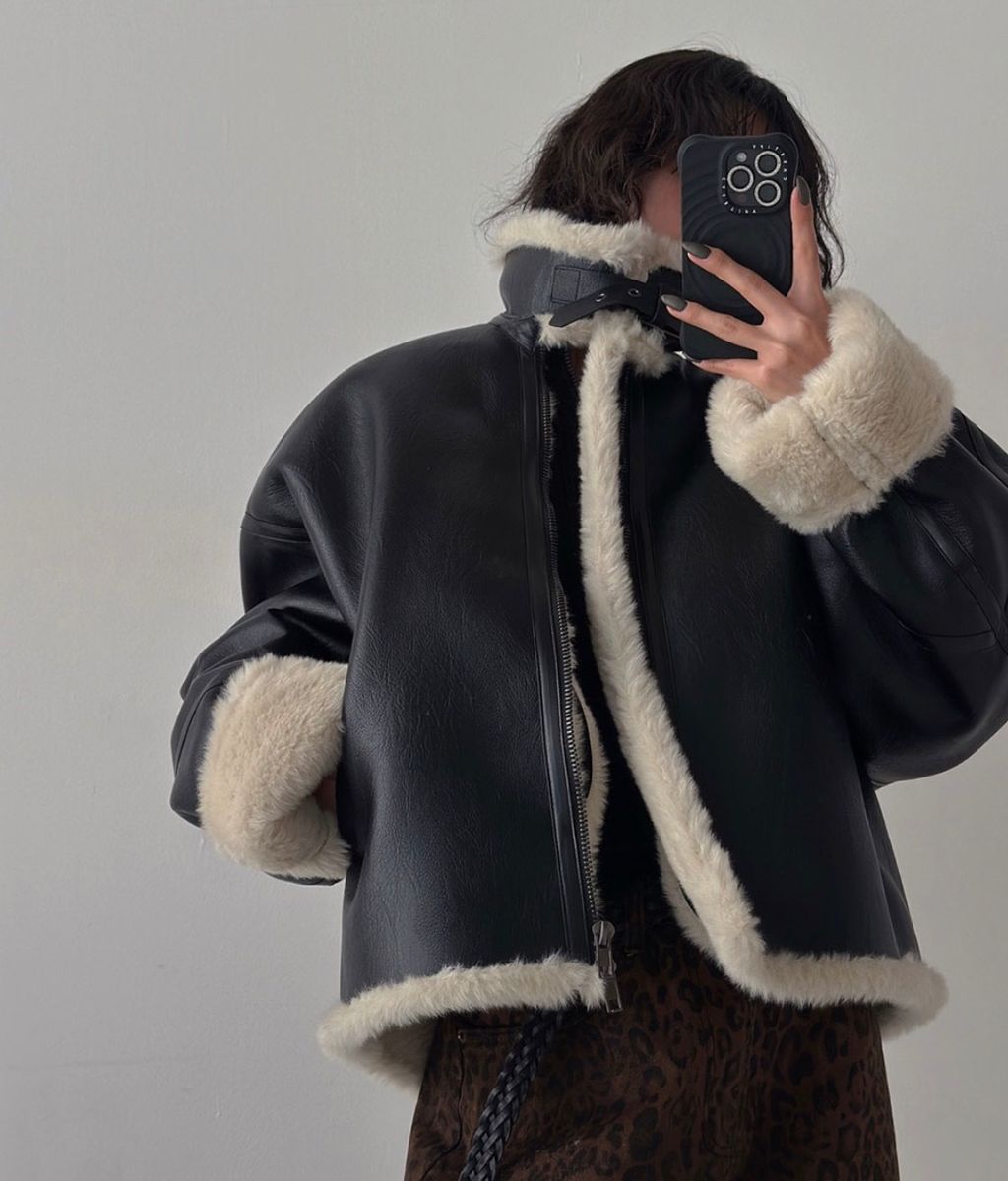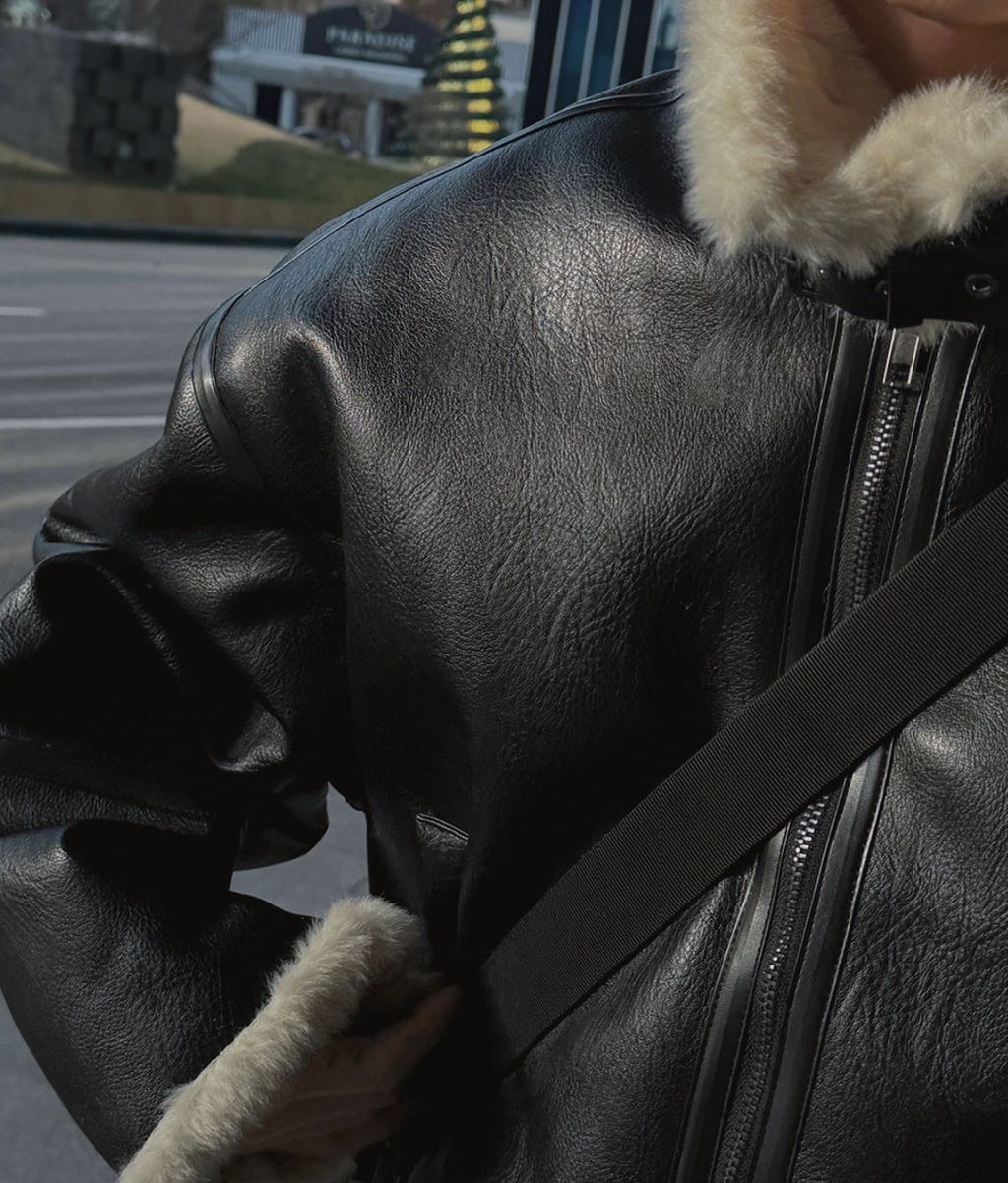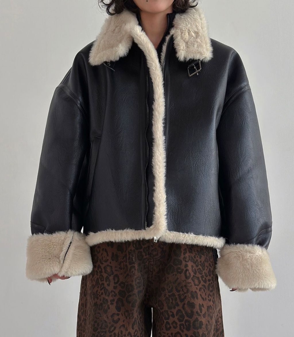 超挺人造皮革鋪毛內裏高領翻領野馬夾克 黑色