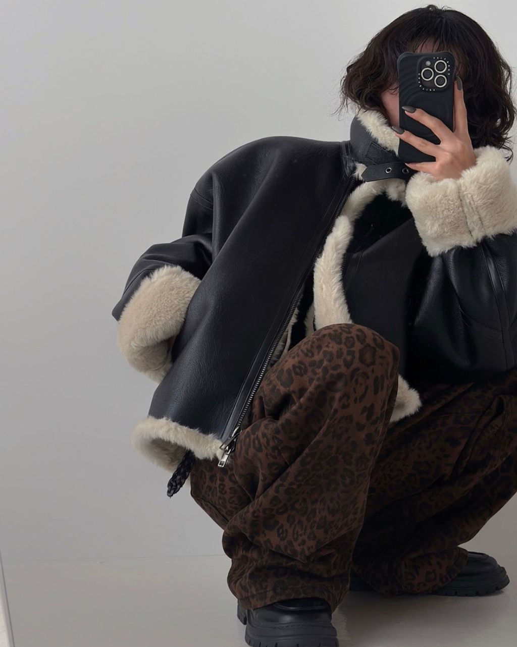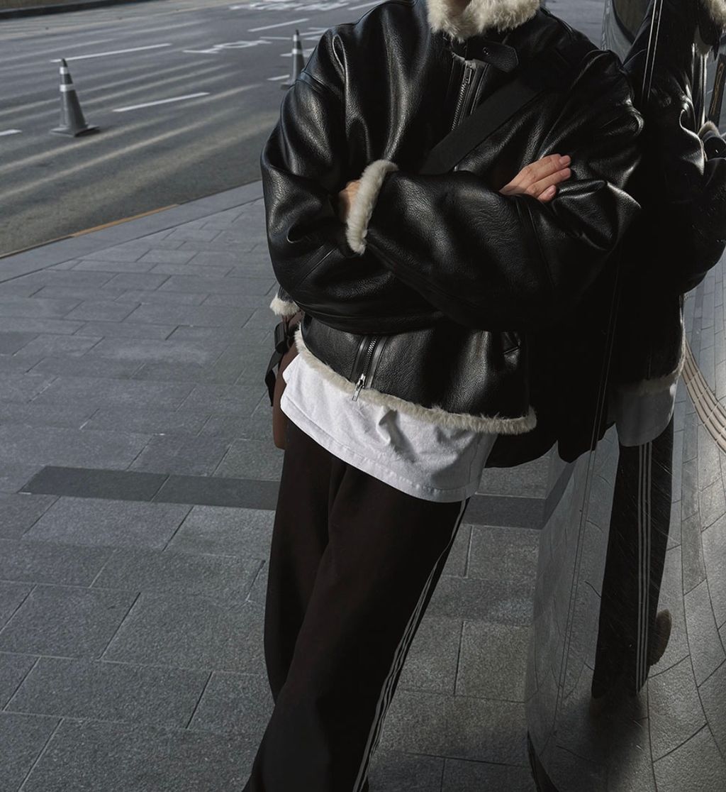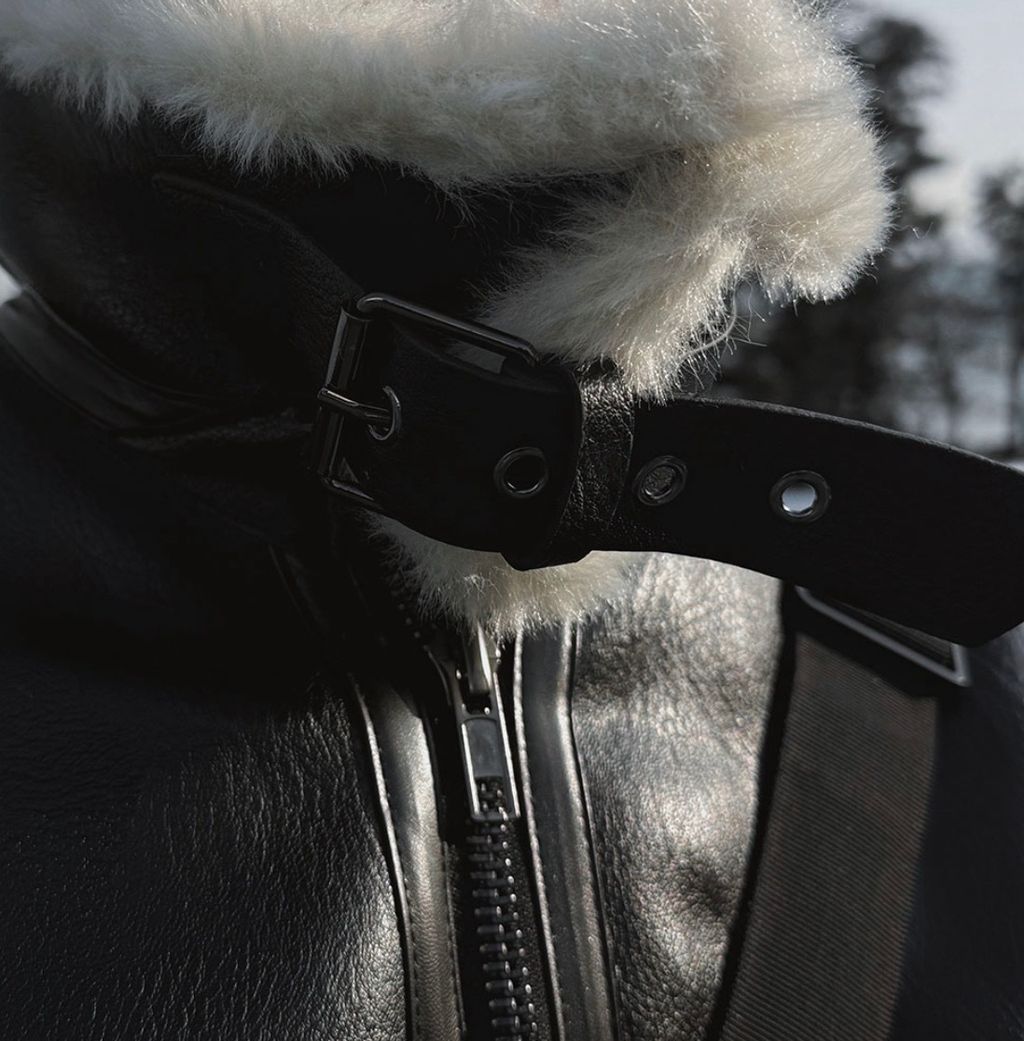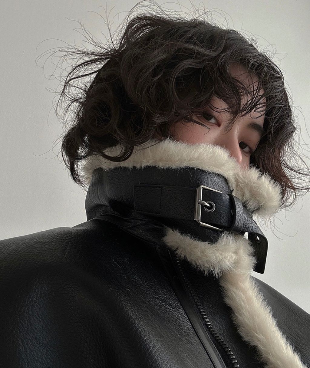 超挺人造皮革鋪毛內裏高領翻領野馬夾克 黑色